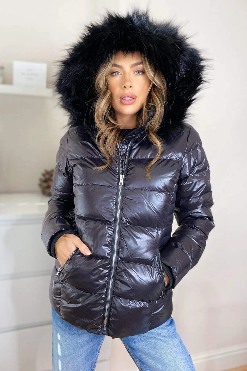 Update your winter wardrobe with this Black Faux Fur Wet Look Coat. With a faux fur hood and a zip front fastening. This coat will go with any outfit and will look stylish while still being warm! Pair with some skinny jeans and boots for the perfect outfit!