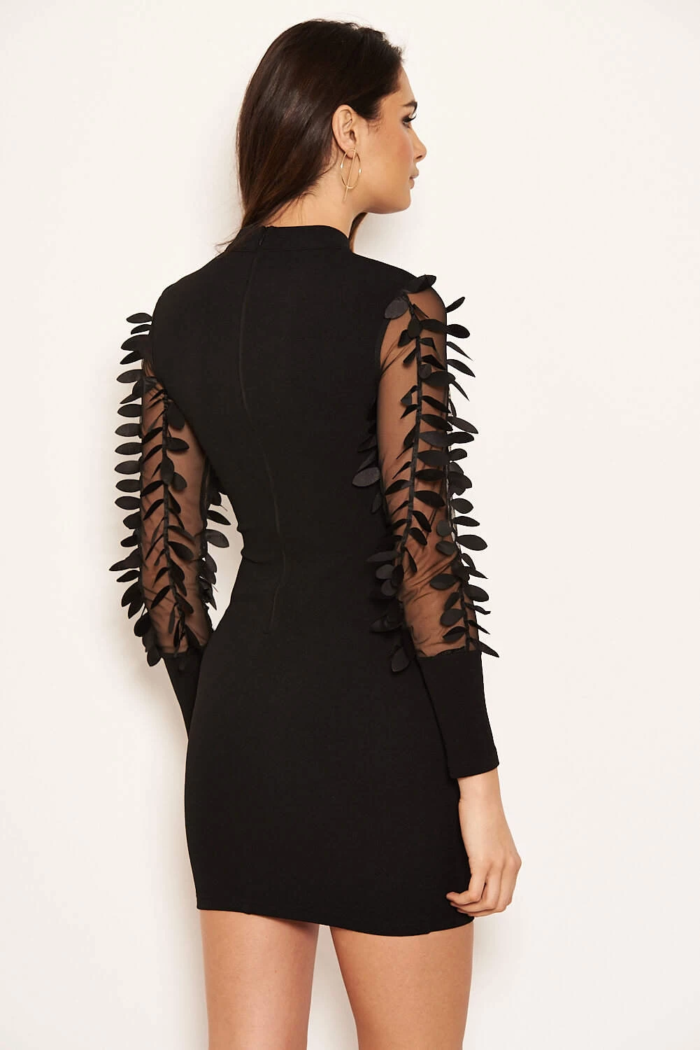 Stand out in our Black Leaf Mesh Sleeve Bodycon Dress. It’s the ultimate LBD! Featuring stylish leaf mesh long sleeves with a deep cuff, a high neck and a classic bodycon fit to show off your figure! Pair some with black heels and statement earrings to complete this look.
