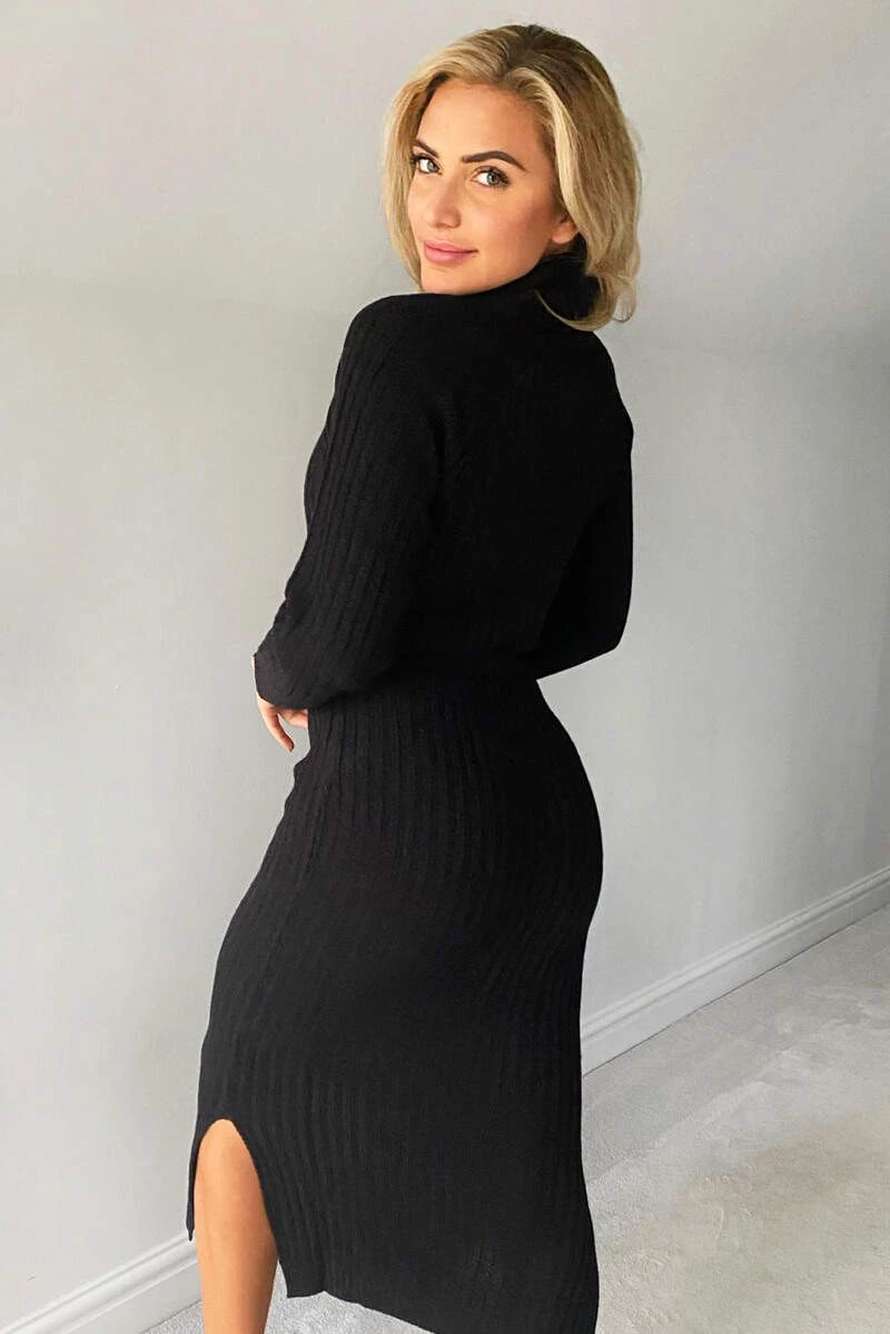 Just because it’s winter doesn’t mean you can’t still rock a dress out! Stay cosy yet trendy in this Black Long-line Roll Neck Knitted Dress. Featuring a high roll neck, a midi length and a tie waist belt. Style with heeled boots and a matching bag for an effortless glam