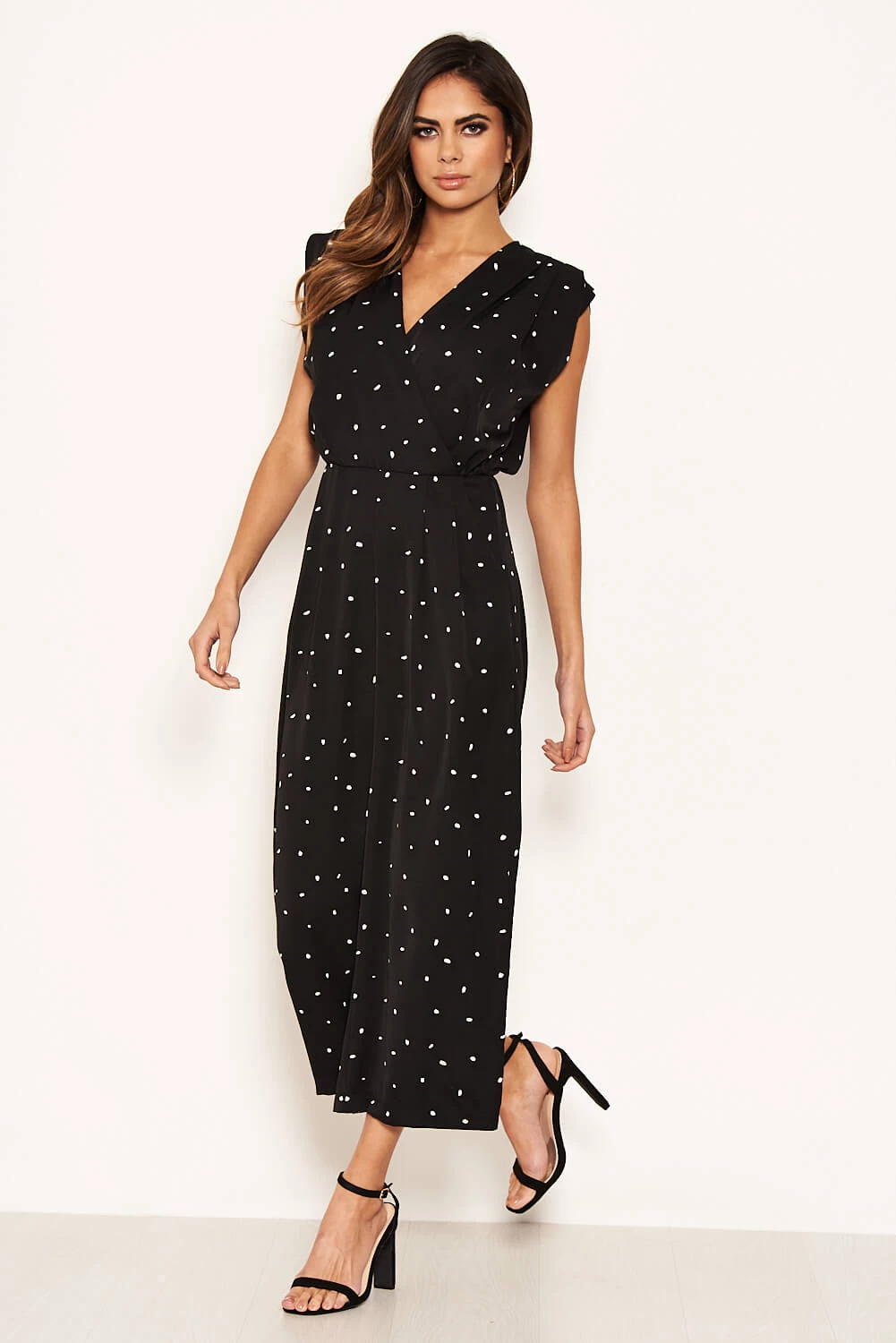 This Black Spotty Wrap Culotte Jumpsuit is the perfect culotte