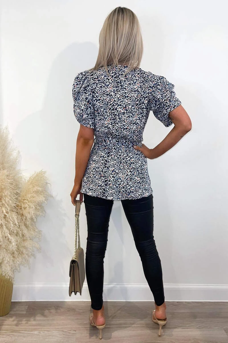Feel super cute in this Blue Floral Printed Wrap over Top . Taking