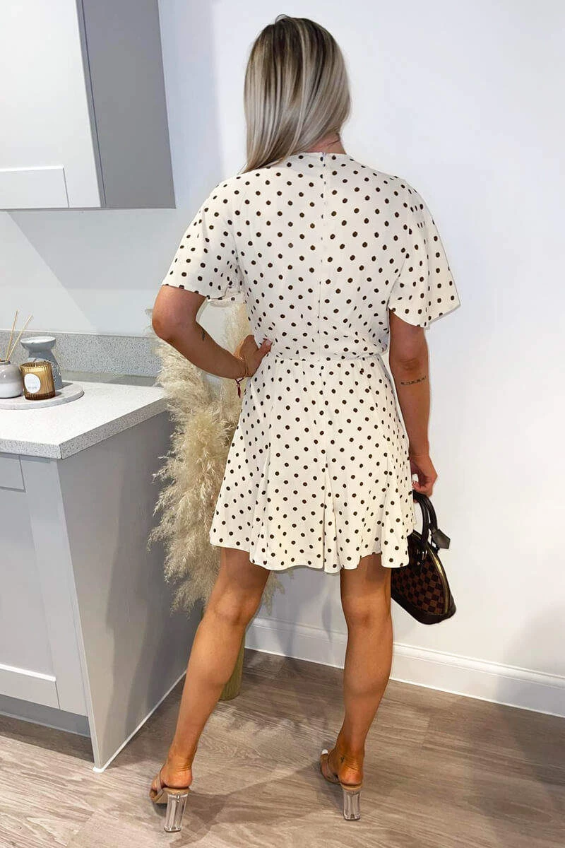 This Cream and Brown Spotty Butterfly Sleeve Pleated Mini Dress is the