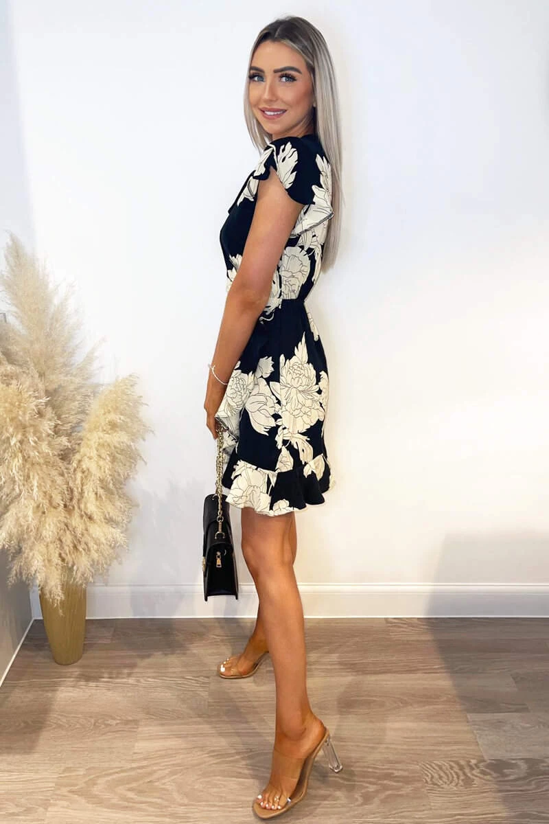 Print Short Sleeve Wrap Mini Dress. Featuring short frill sleeves, a