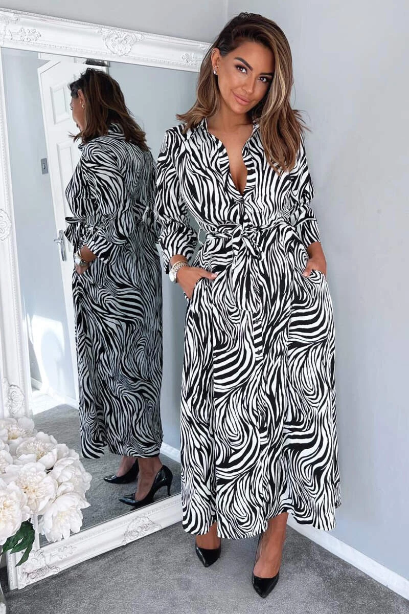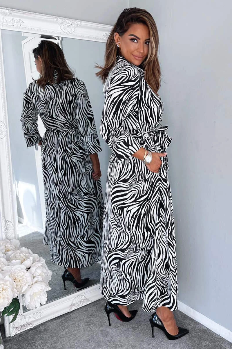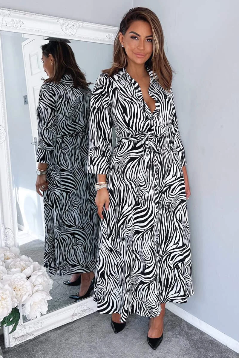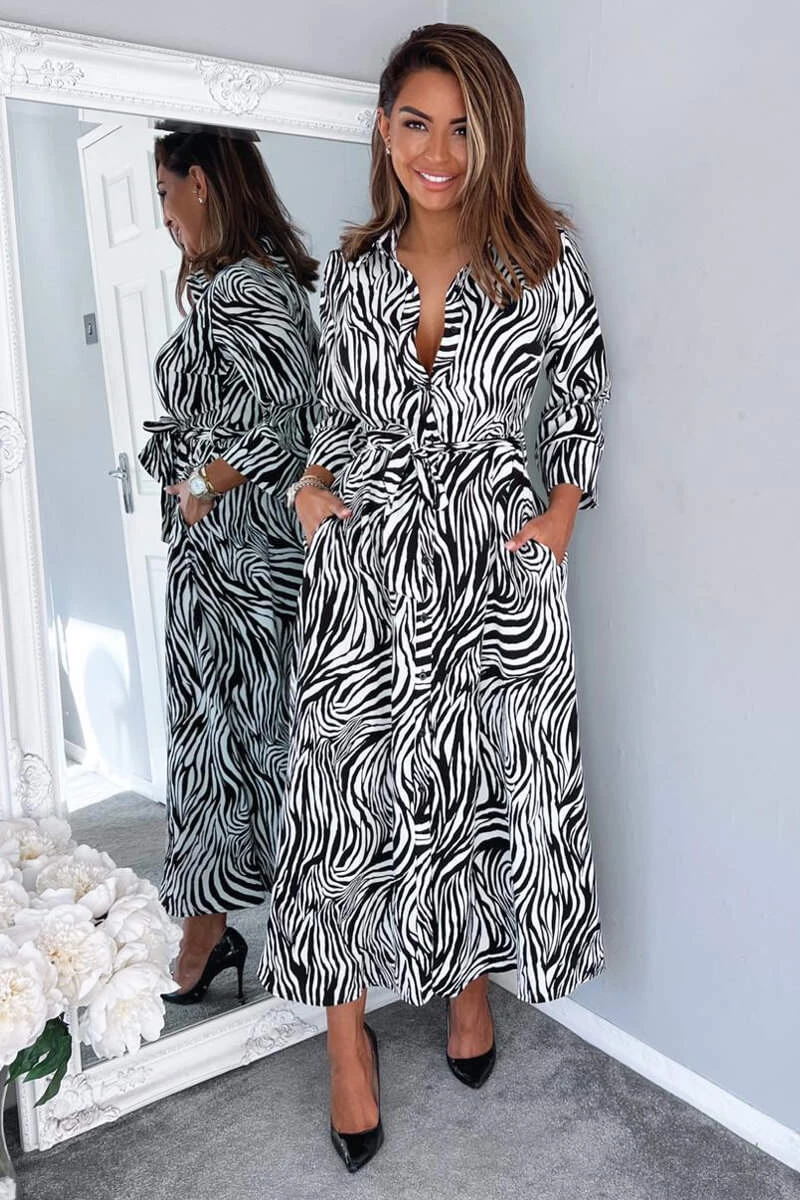 Stay on trend in our Black And White Zebra Print Midi Shirt Dress.