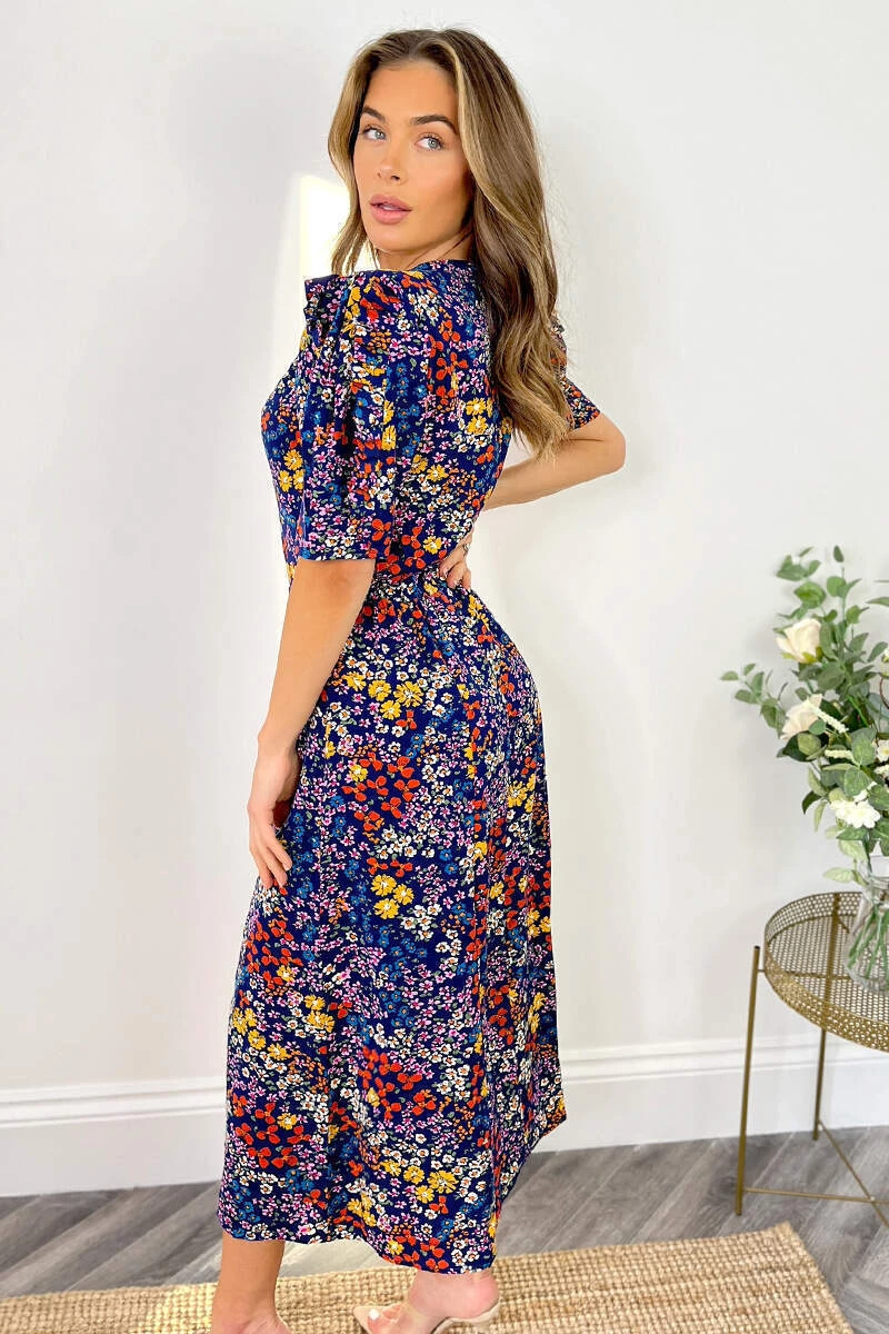 Look sophisticated in our Blue Floral Pleated Sleeve Split Leg Midi