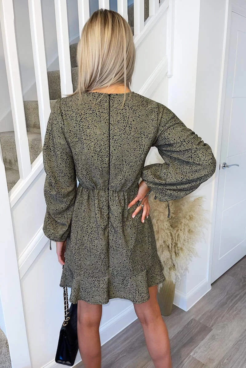 This Khaki Printed Gathered Split Sleeve Skater Dress is the perfect