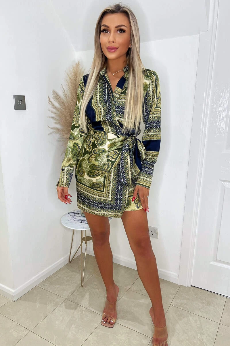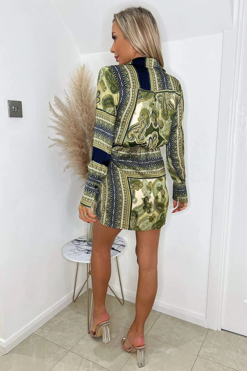 Our Khaki Scarf Print Tie Detail Shirt Dress is so easy to dress up or