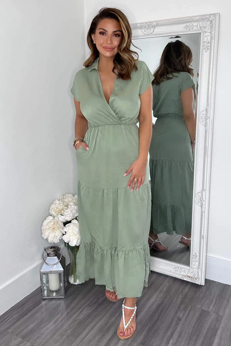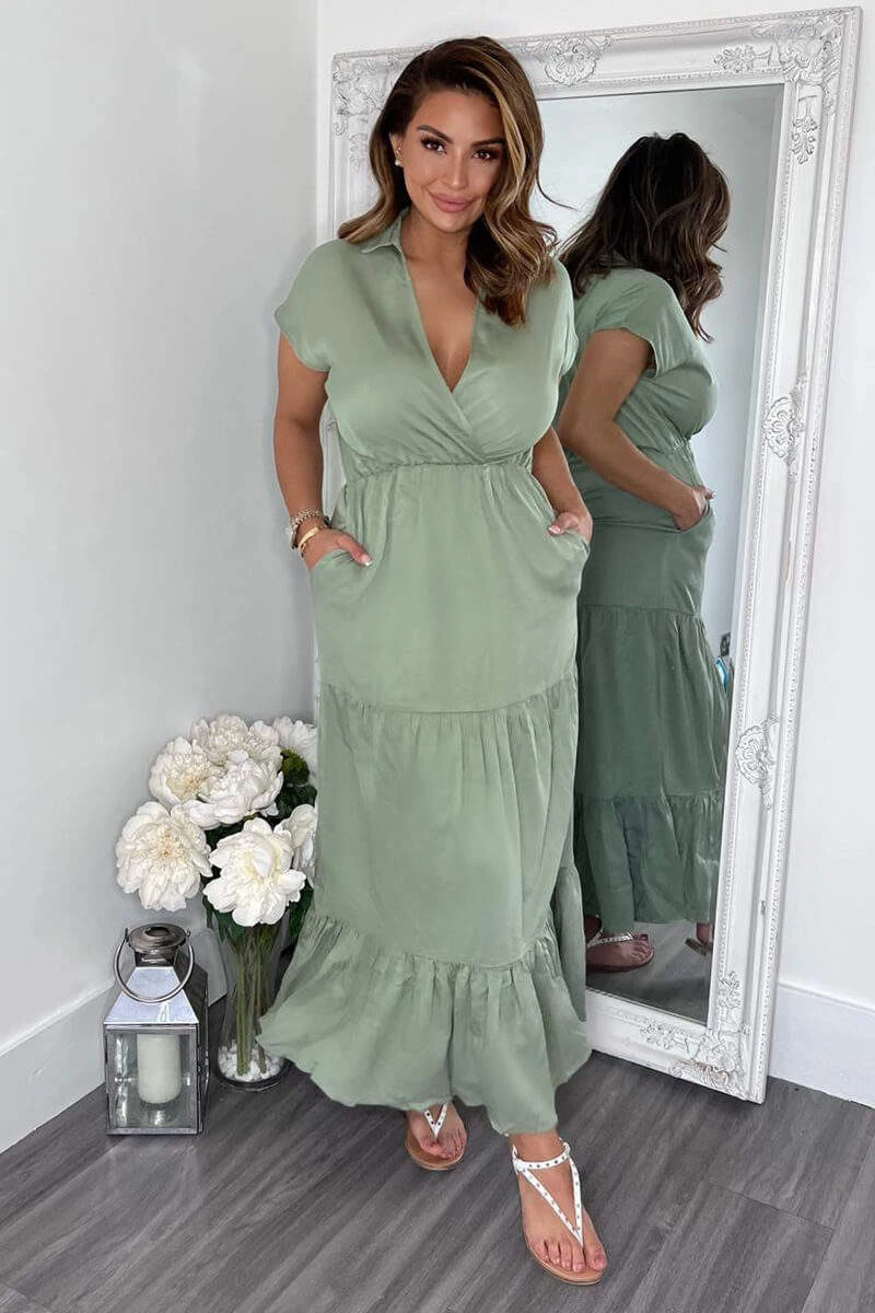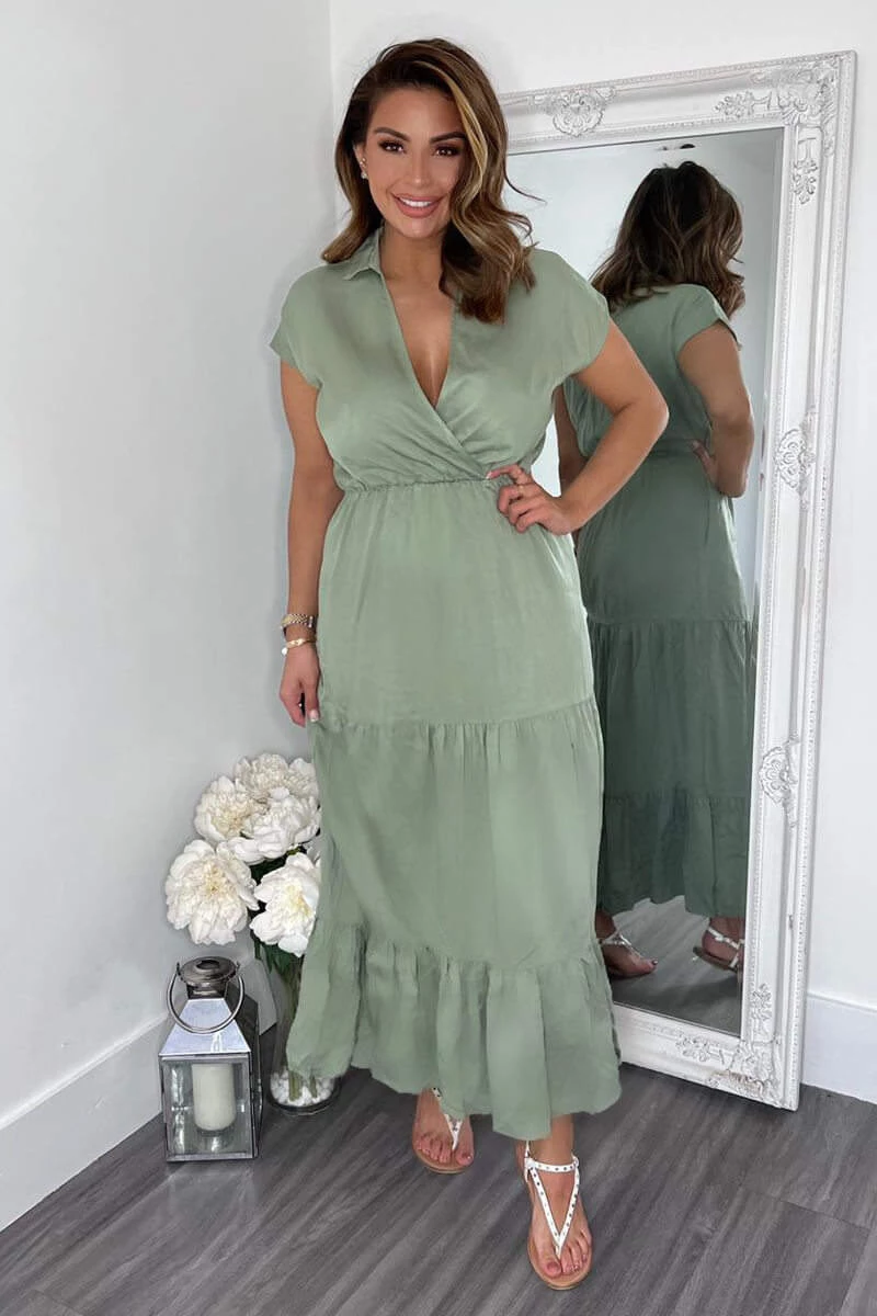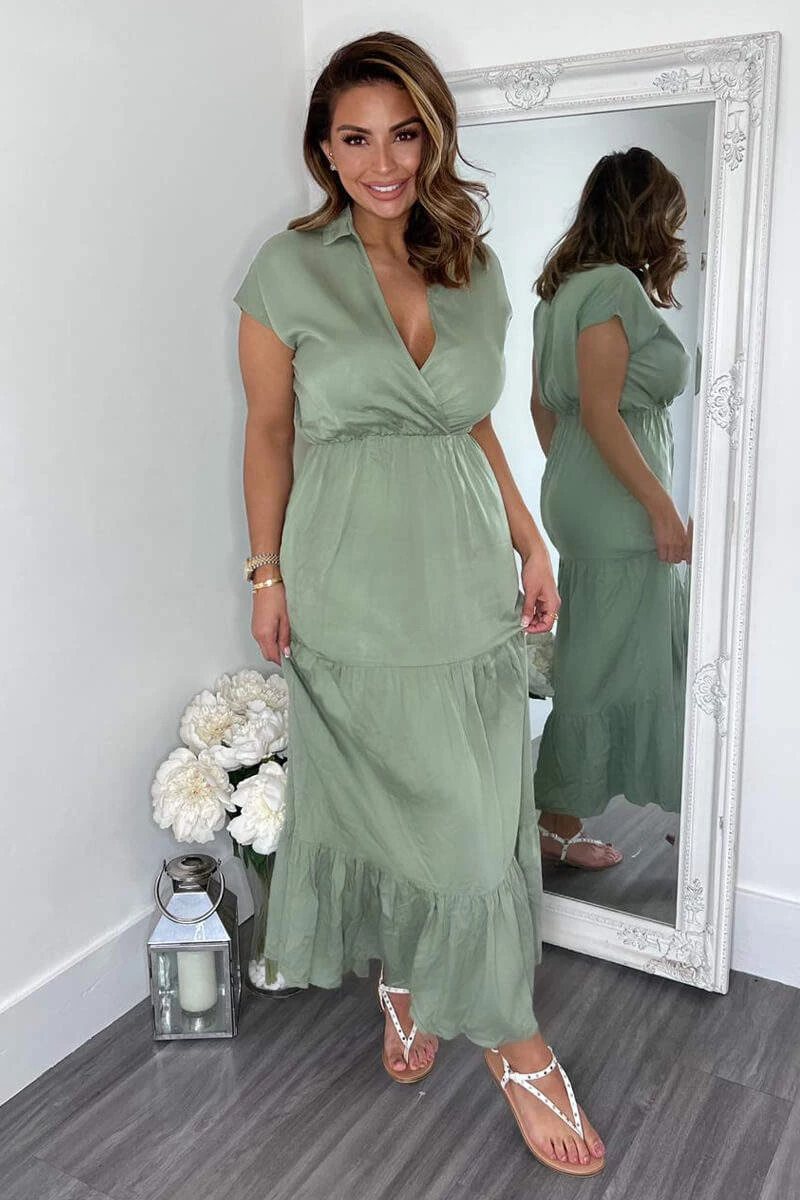 Our Khaki Short Sleeved V-Neck Midi Smock Dress is a wardrobe must