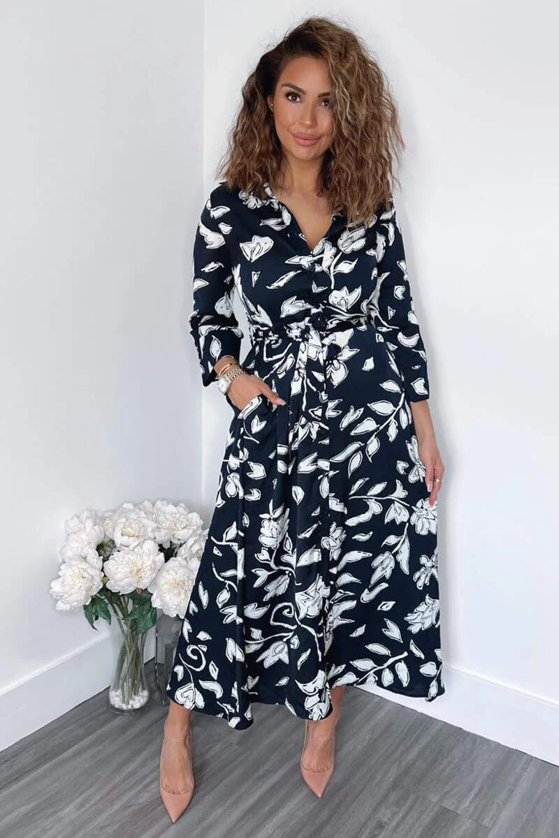Stay on trend in our Navy And White Floral Printed Button Up Midi
