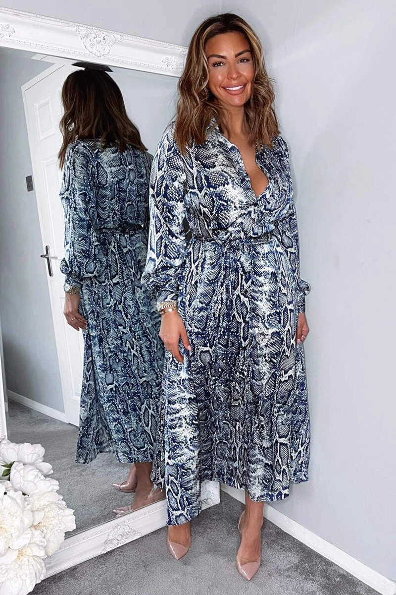 Stay on trend in our Navy Snake Print Tie Waist Midi Shirt Dress.