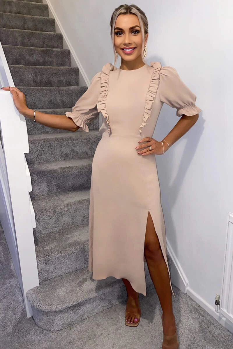 Look sophisticated yet trendy in our Nude Ruffle Split Leg Midi Dress.