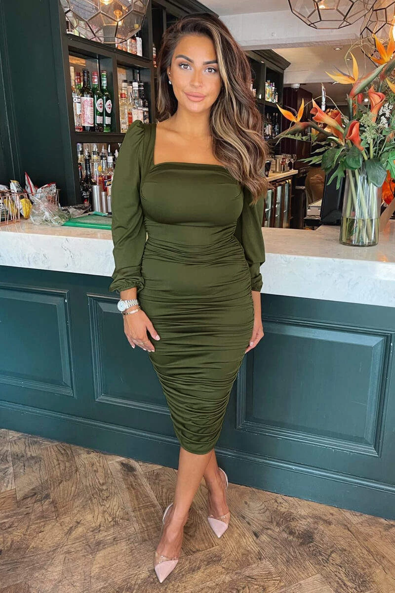 This Olive Square Neck Ruched Midi Dress is the perfect way to get