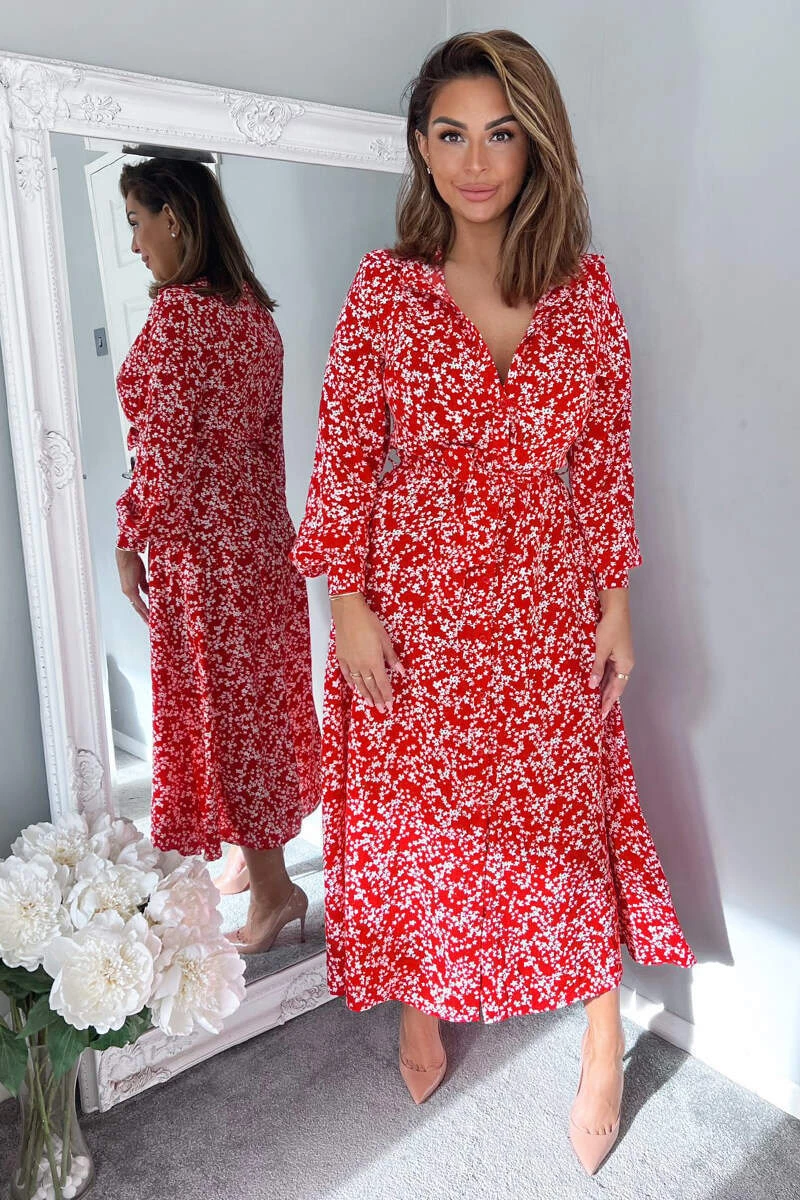 Stay on trend in our Red Floral Print Button Up Midi Shirt Dress.