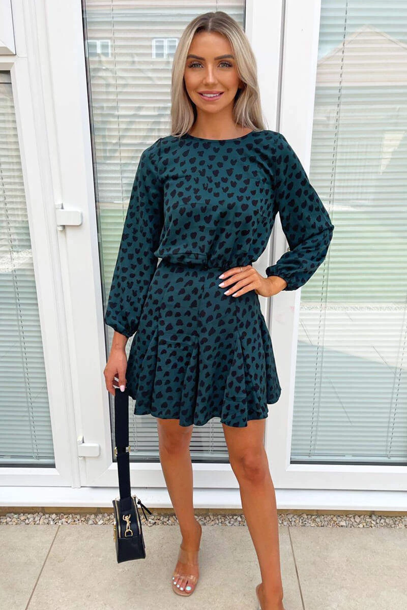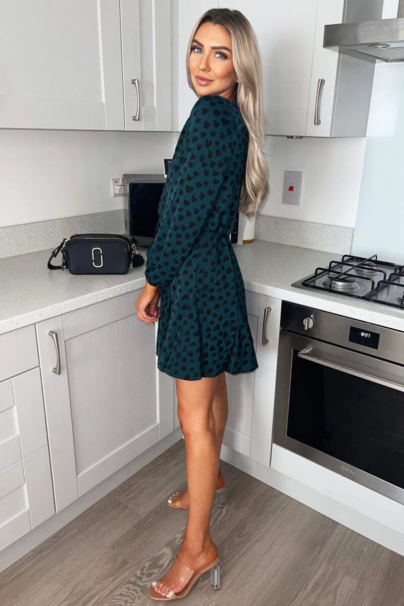 This Teal Heart Print Pleat Long Sleeve Dress is the perfect day