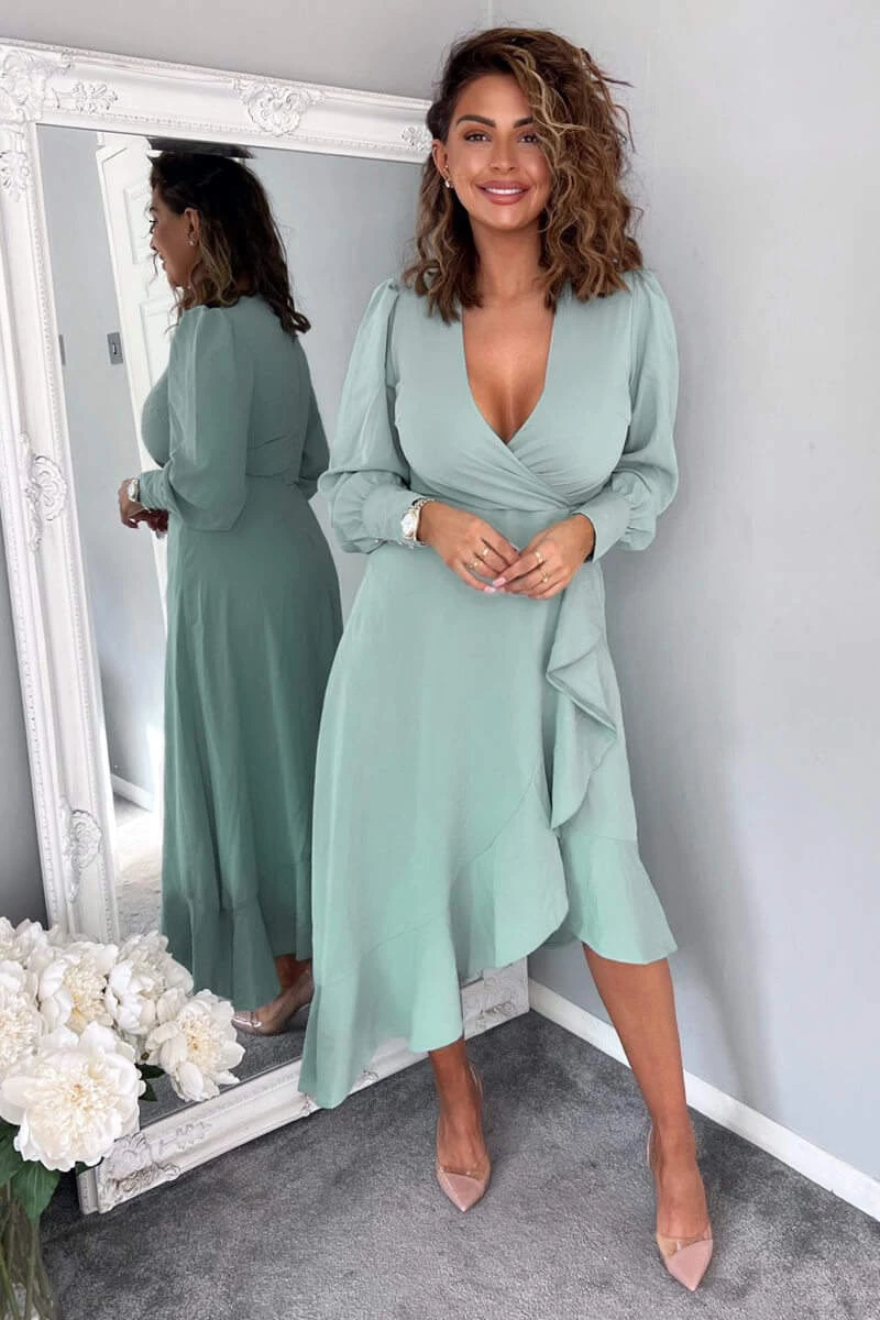 Look sophisticated in this Duck Egg Long Sleeve Frill Wrap Midi Dress.