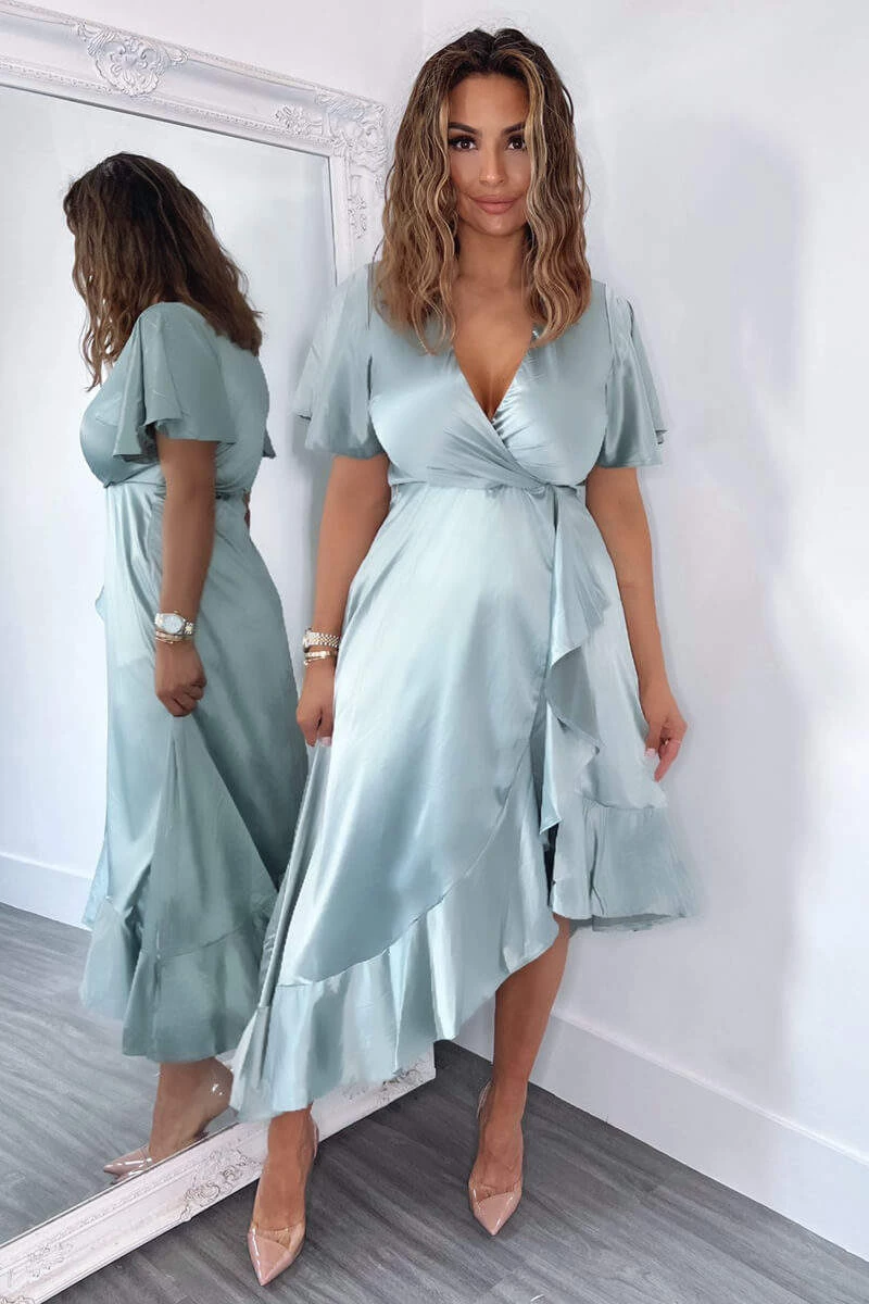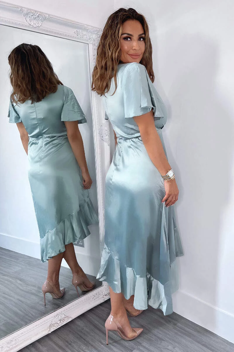 Our Duck Egg Satin Frill Hem Short Sleeve Midi Dress is the perfect