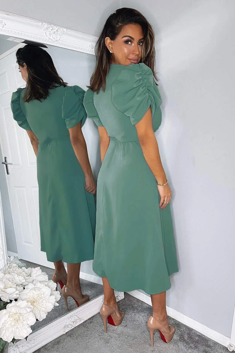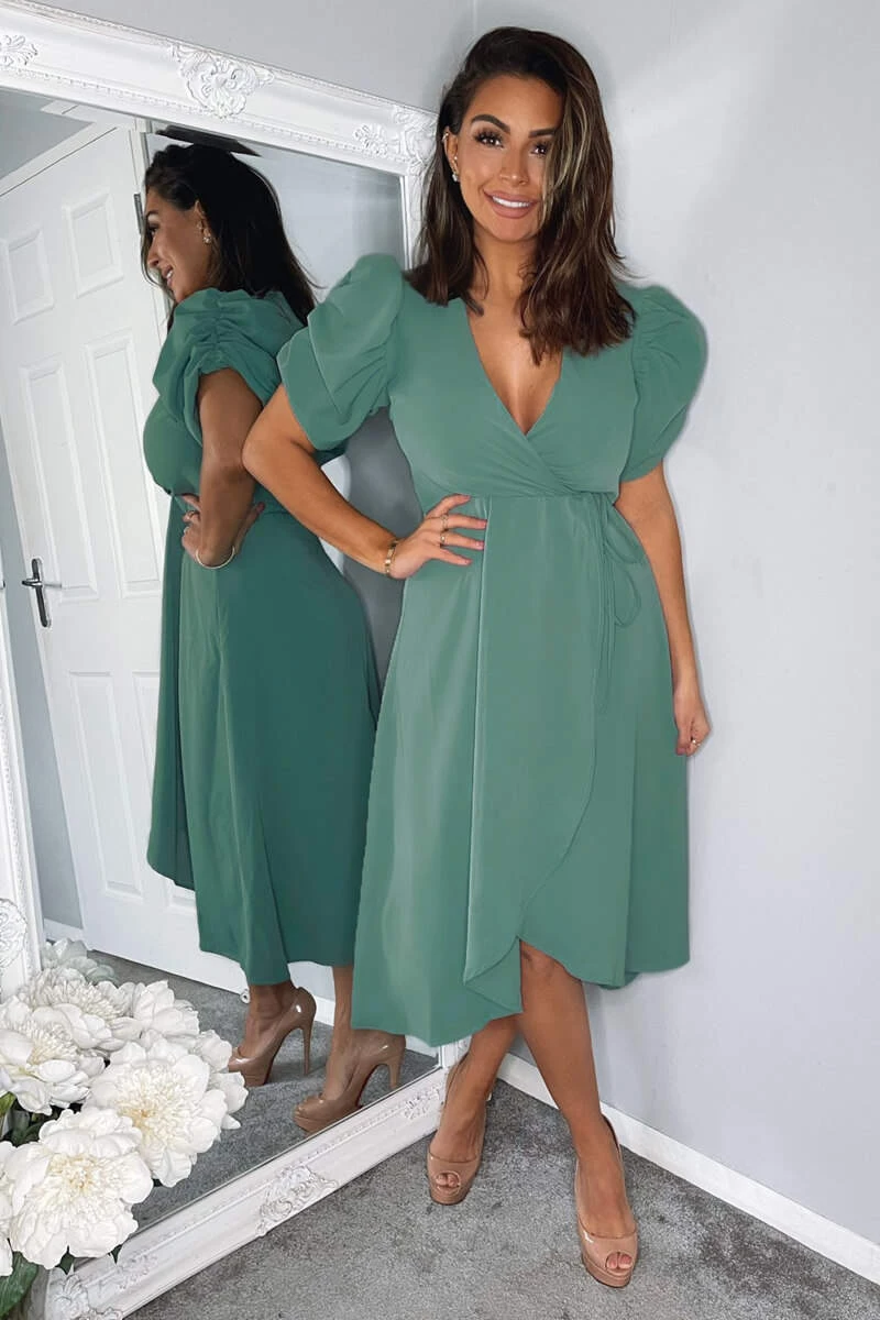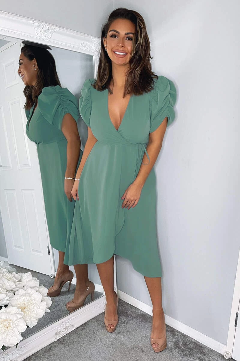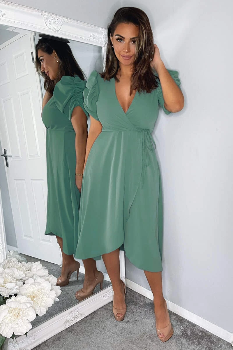Stay sophisticated in this Duck Egg Wrap Over Tie Midi Dress.