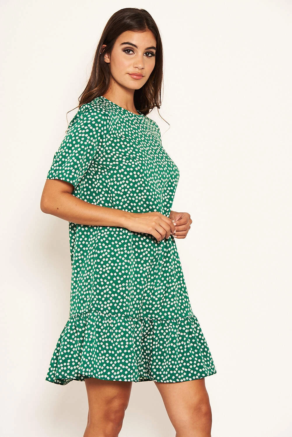 Brighten up your summer wardrobe with our Green Floral Frill Hem Swing Dress. Its straight t-shirt fit and frill hem line gives this dress a basic style. Pair with sandals and a cute bag to complete the look!