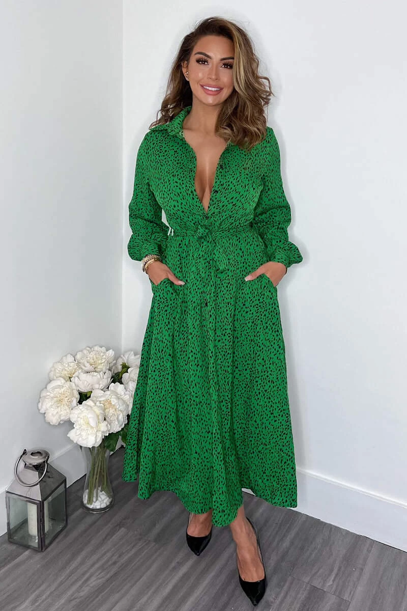 Stay on trend in our Green Printed Button Up Midi Shirt Dress.