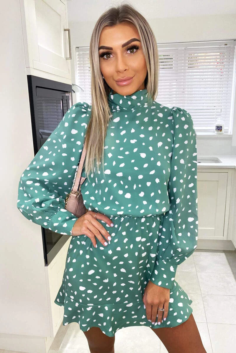 Stay trendy with this Green Printed High Neck Skater Dress! Features a