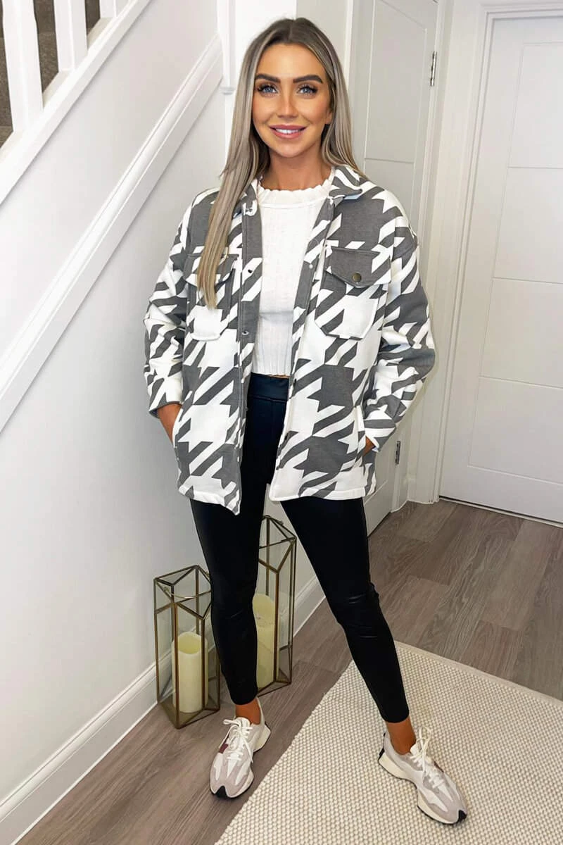 Our Grey Large Dogtooth Print Shirt Jacket is a must have this season!