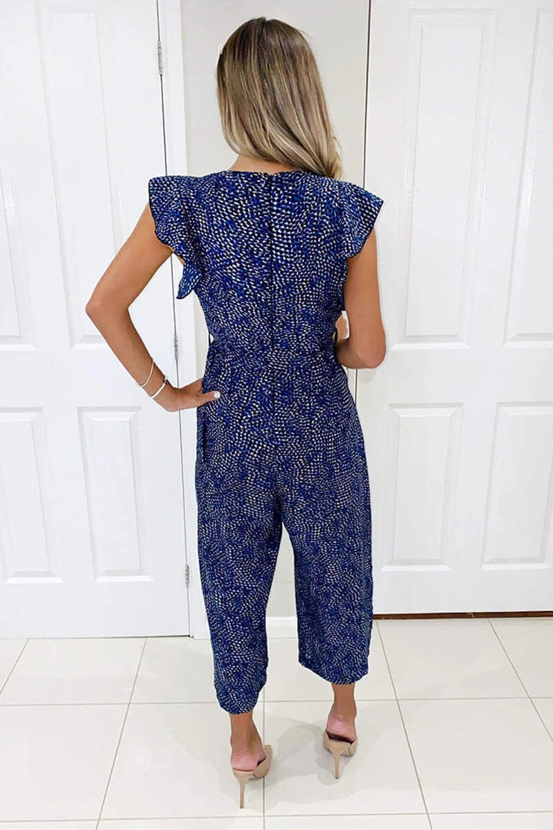 Our Blue Printed V-Neck Frill Jumpsuit is perfect for any occasion, featuring a D-ring belt and a wrap over v neck! Dress up with heels or for a more casual look add trainers or flats.