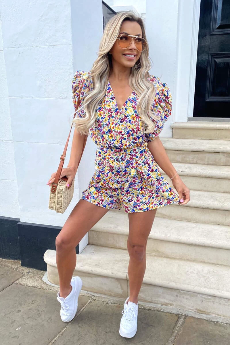Puff Sleeve Playsuit . Features ruched puff sleeves, a wrap over