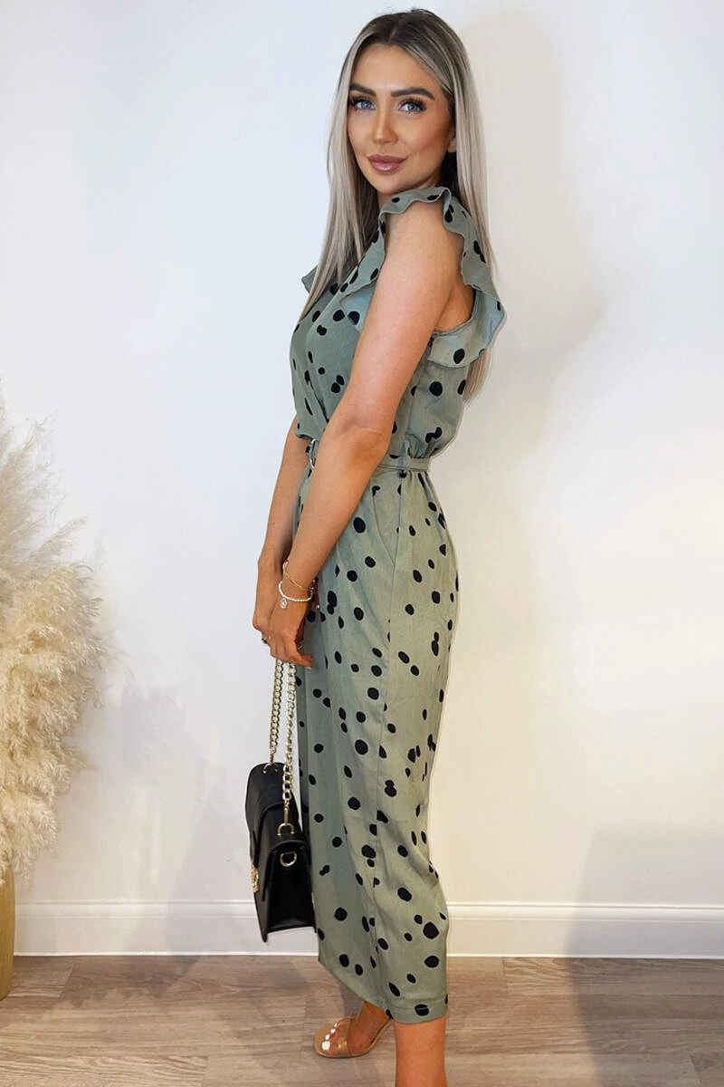 Look chic in our Khaki And Black Dotty Wrap Front Belted Jumpsuit.