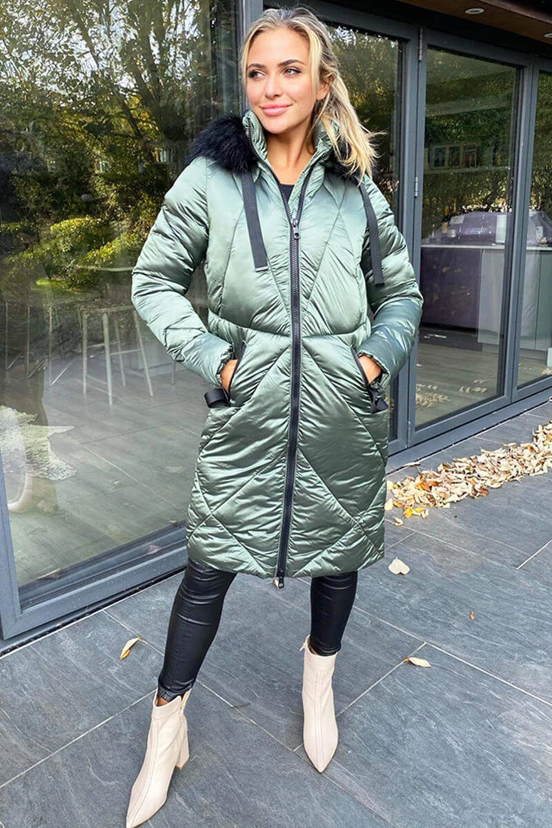 Stay right on trend this season with our Khaki Faux Fur High Shine Coat. It is the essential coat for winter! Featuring a High shine fabric and faux fur hood, pair with some jeans and boots for a cosy winter look!