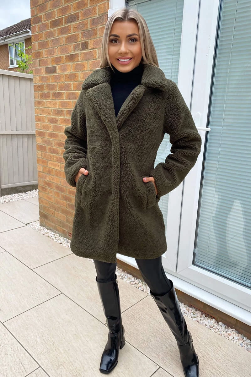 This Khaki Teddy Faux Fur Coat With Collar is perfect to add extra