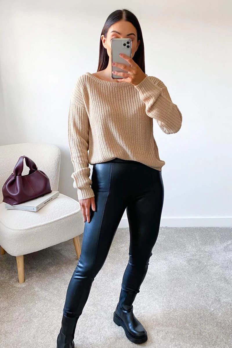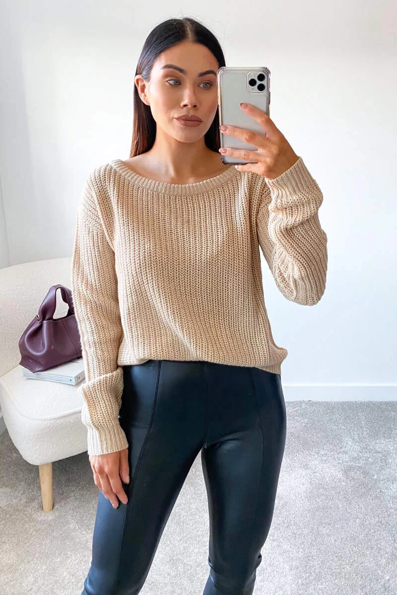 Stone off the shoulder Knitted Jumper ! Featuring a long sleeve and an