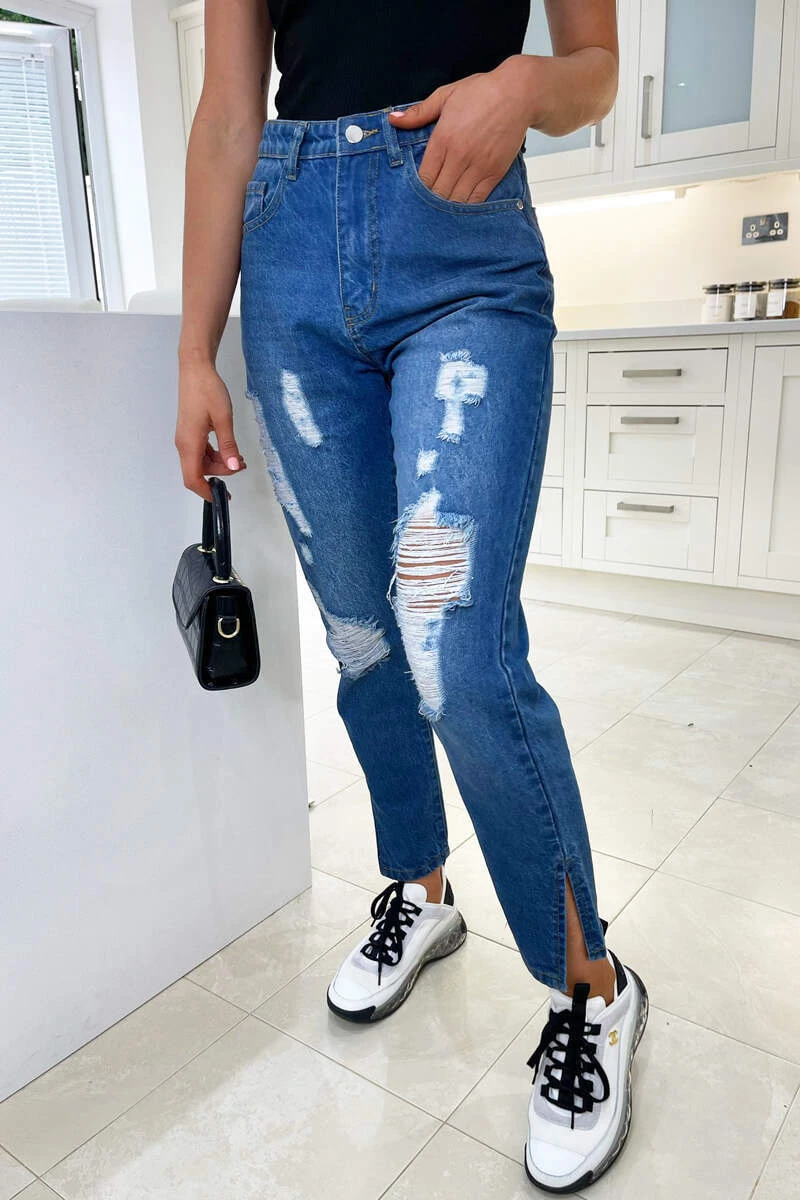 Our Mid Wash Ripped Split Hem Jeans are an essential this season.