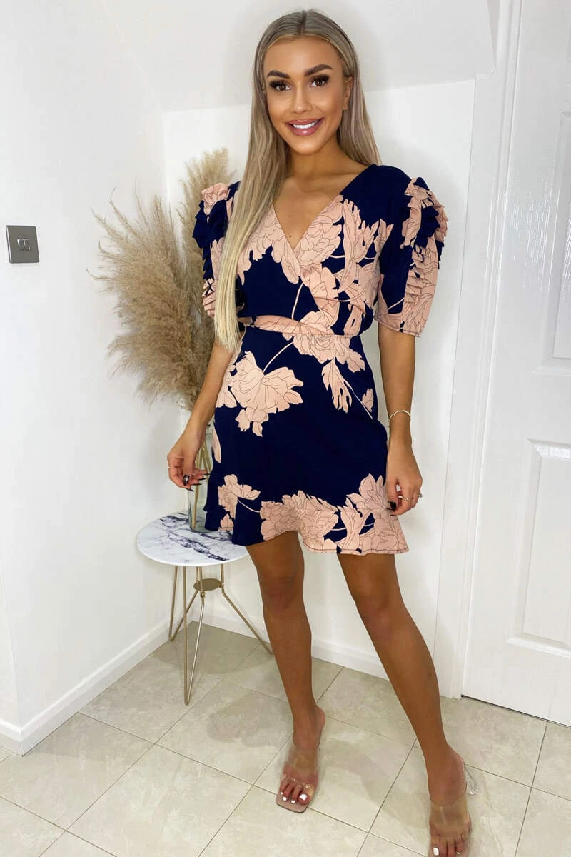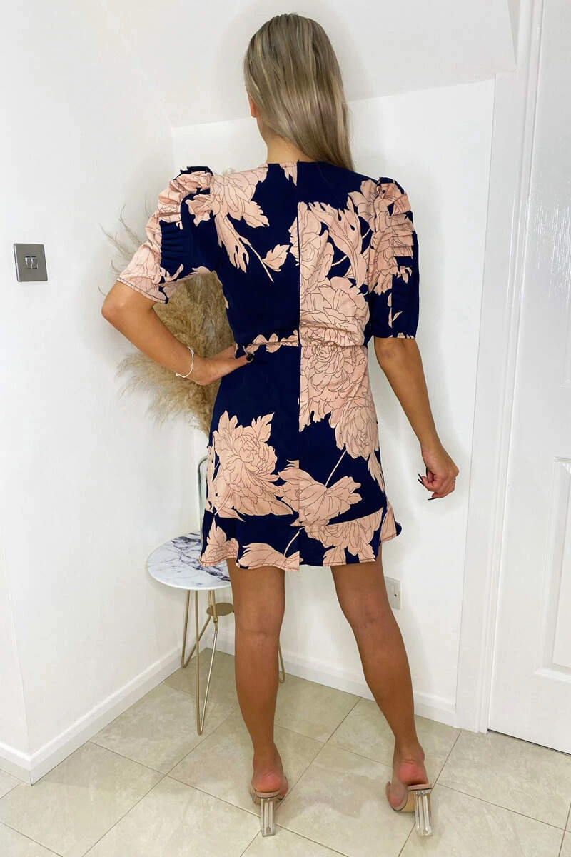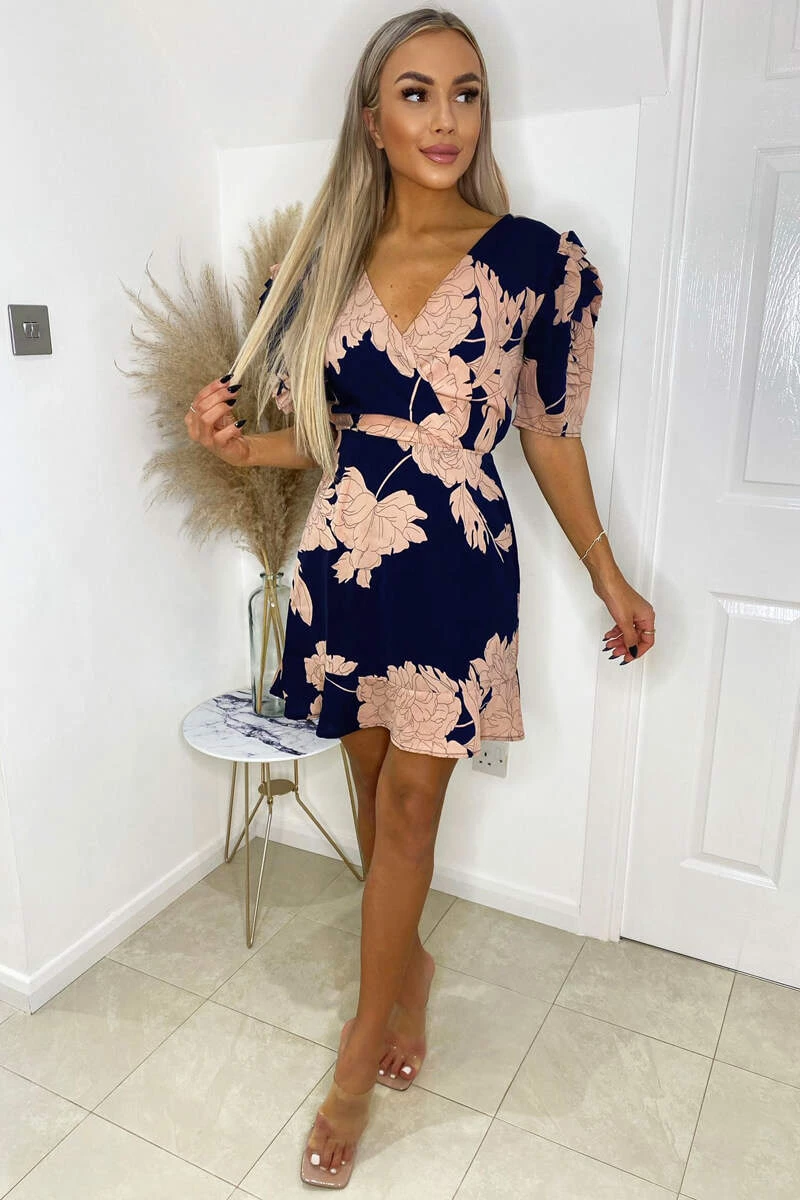 This Navy And Blush Floral Pleated Sleeve Skater Dress is the perfect