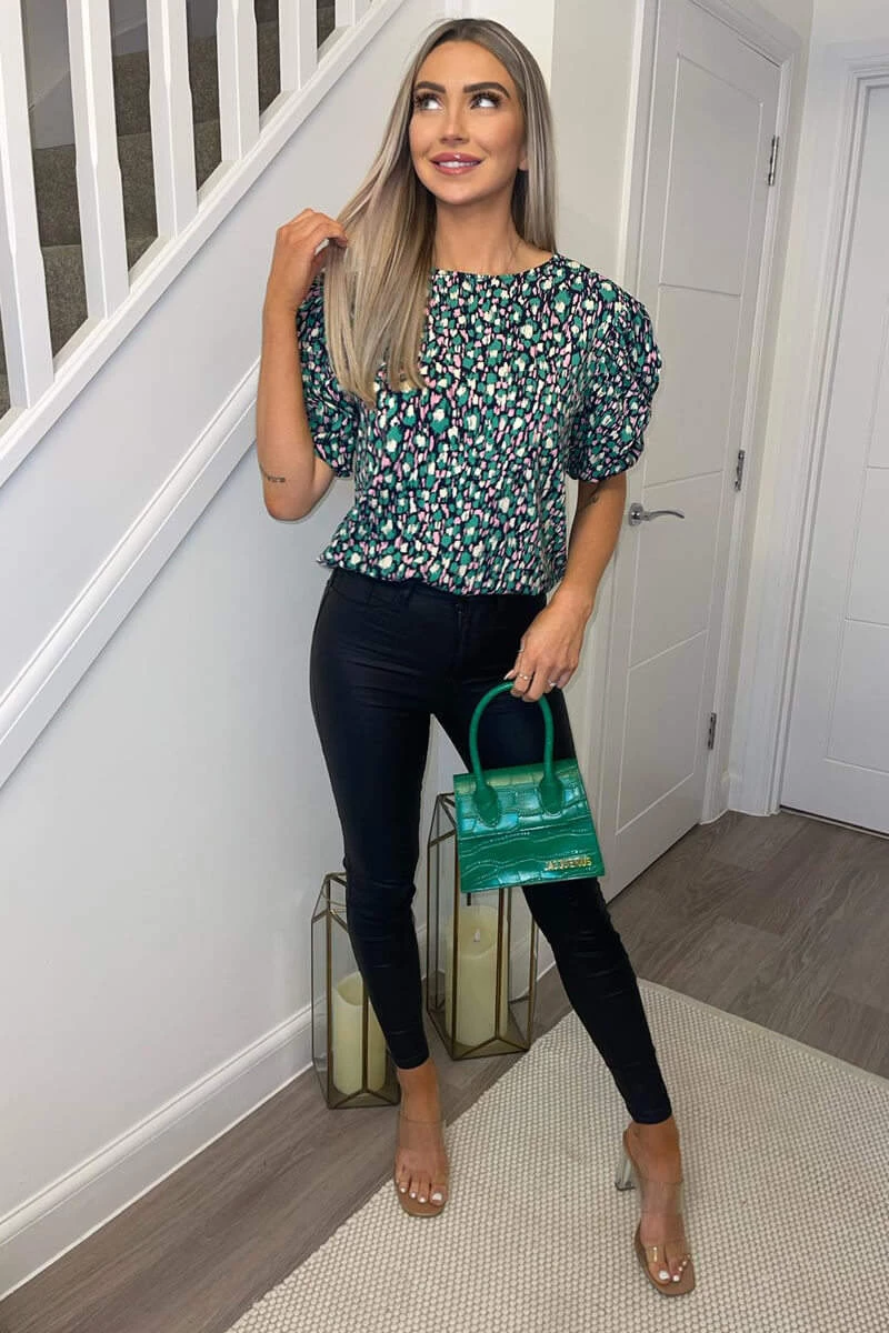 Feel sophisticated in this Navy Green And Pink Printed Balloon Sleeve