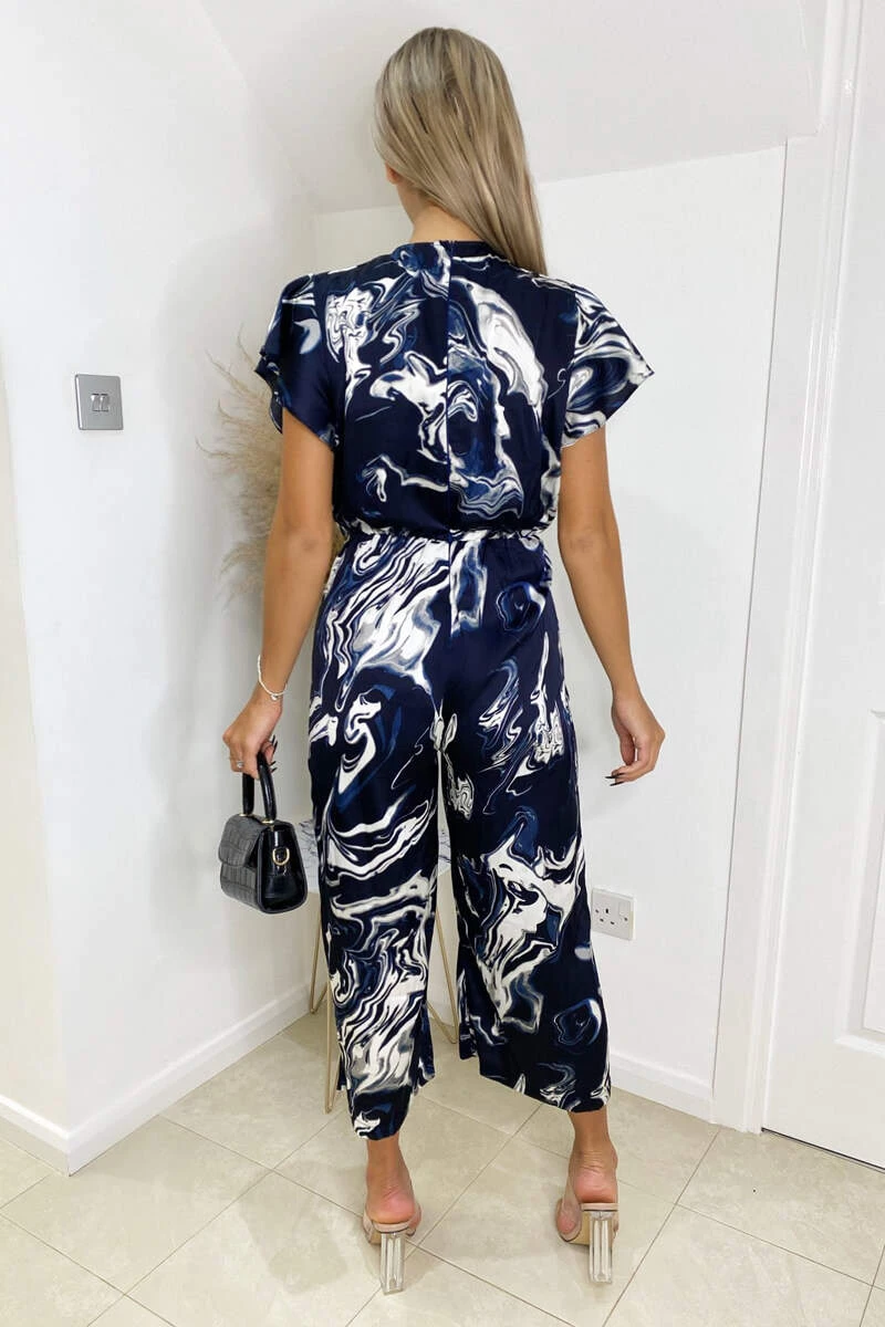 Look chic this season in our Navy Marble Print Wrap Over Frill Sleeve