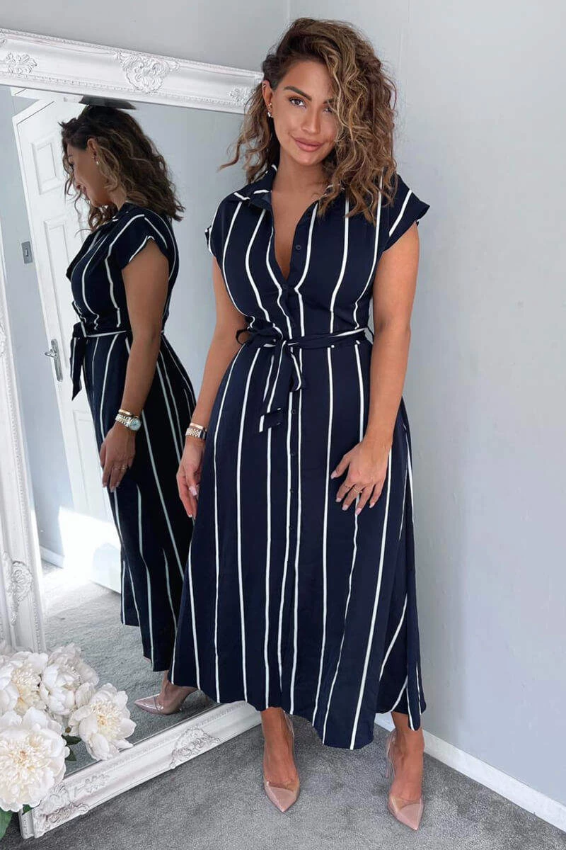 Stay on trend in our Navy Striped Short Sleeve Midi Shirt Dress. This