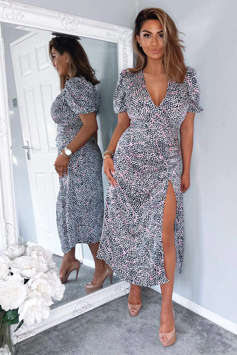 Stay on trend with this Navy White And Pink Printed Ruched Side Midi