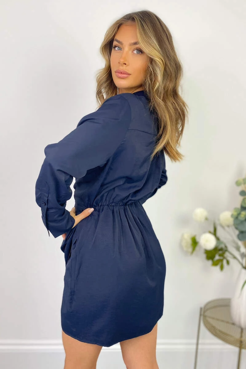 This Navy Wrap Shirt Dress is a must have this season! The ruched side