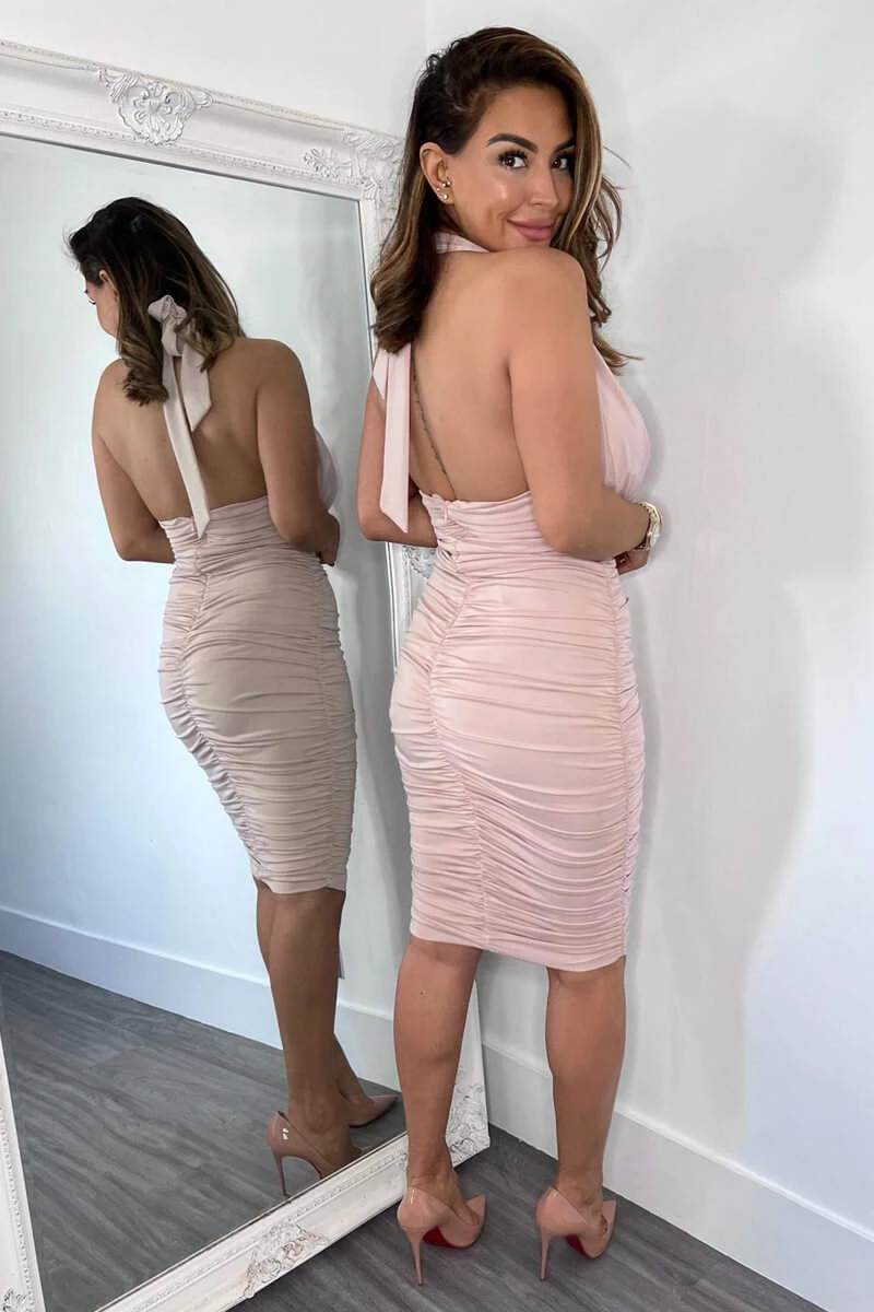 Turn heads in our Nude Halter Tie Neck Ruched Midi Bodycon Dress! This