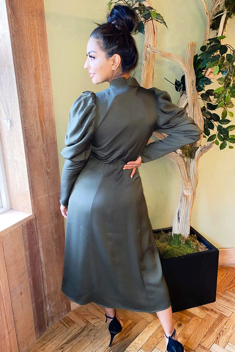 Our Olive Gathered High Neck Split Midi Dress is a perfect evening dress this season. Super sophisticated. Features a high neck, gathered detailing at the bust, double puff sleeves, split leg and a zip up back. Stay classy and simply style the dress with black or