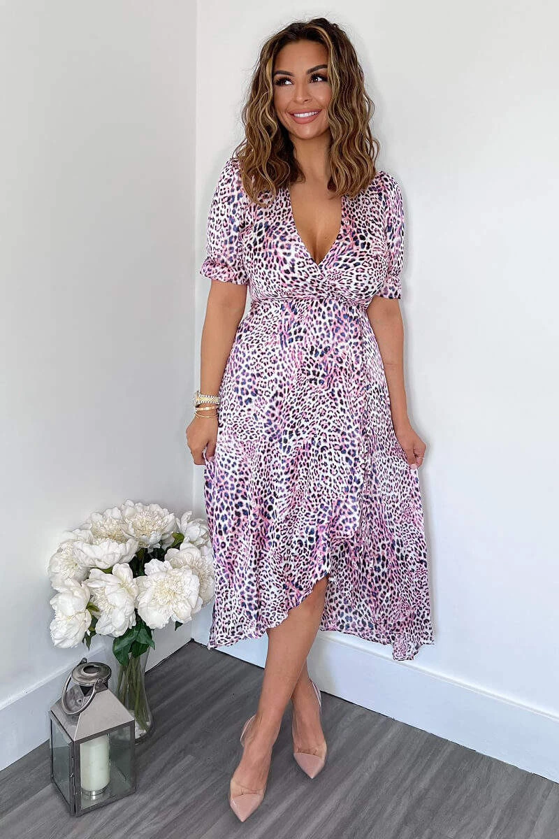 Stay sophisticated in this Pink Animal Print Wrap Side Tie Midi Dress.