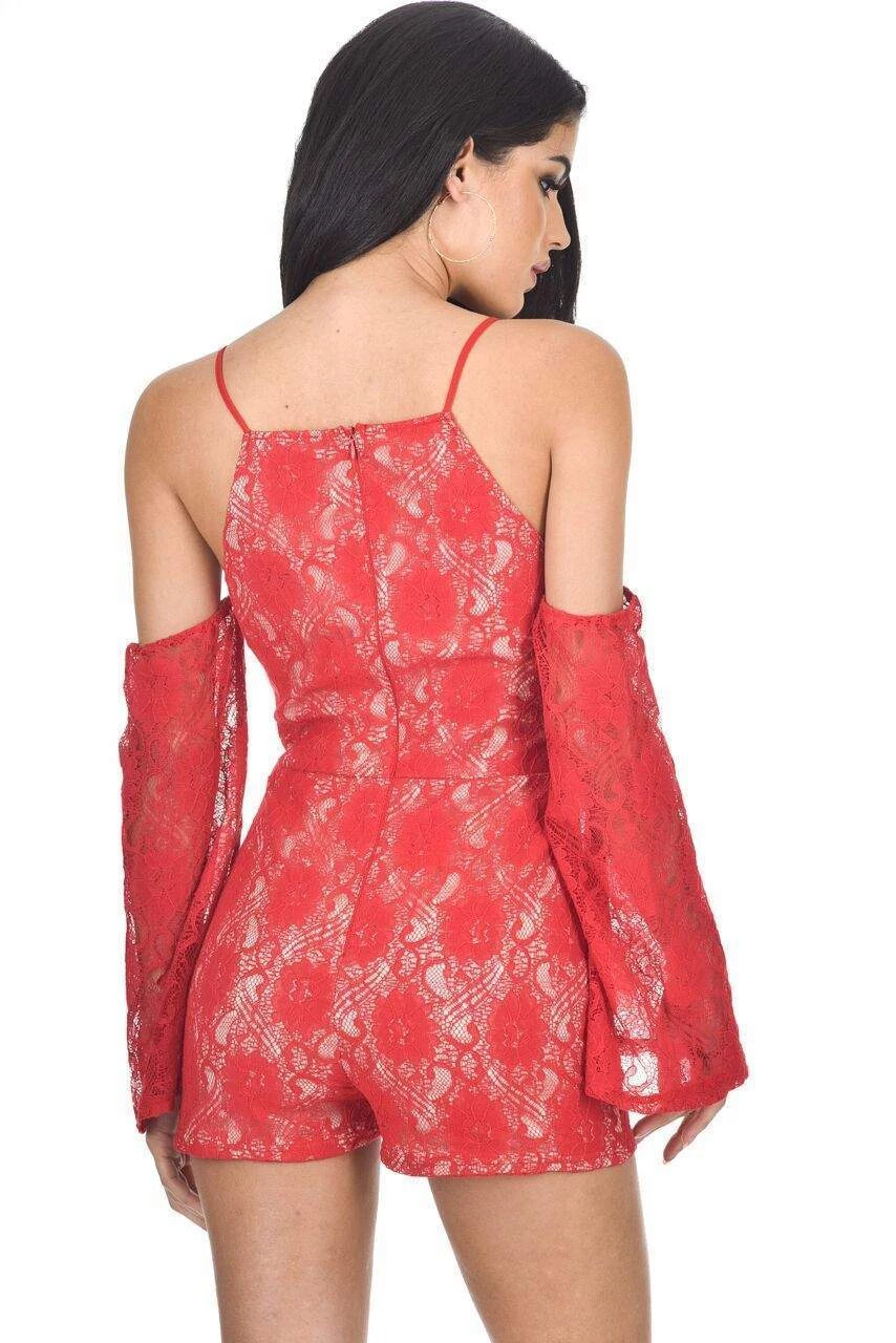 This red cut out shoulder lace contrast playsuit is perfect for a
