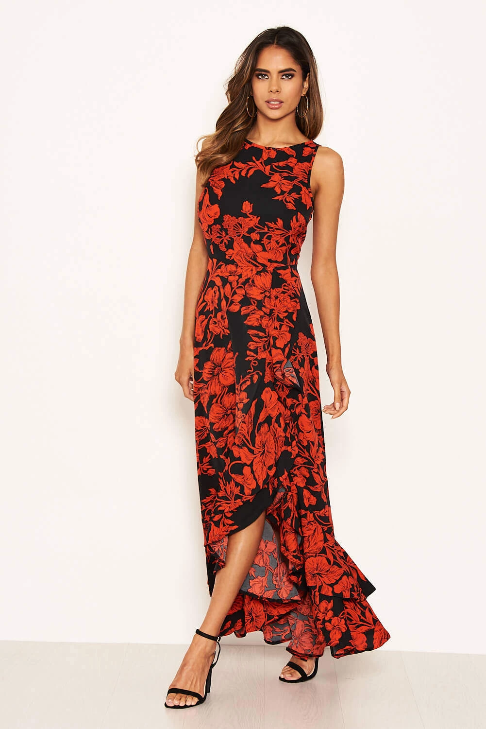 Feel fabulous in this Red Floral Frill Hem Maxi Dress! Giving you