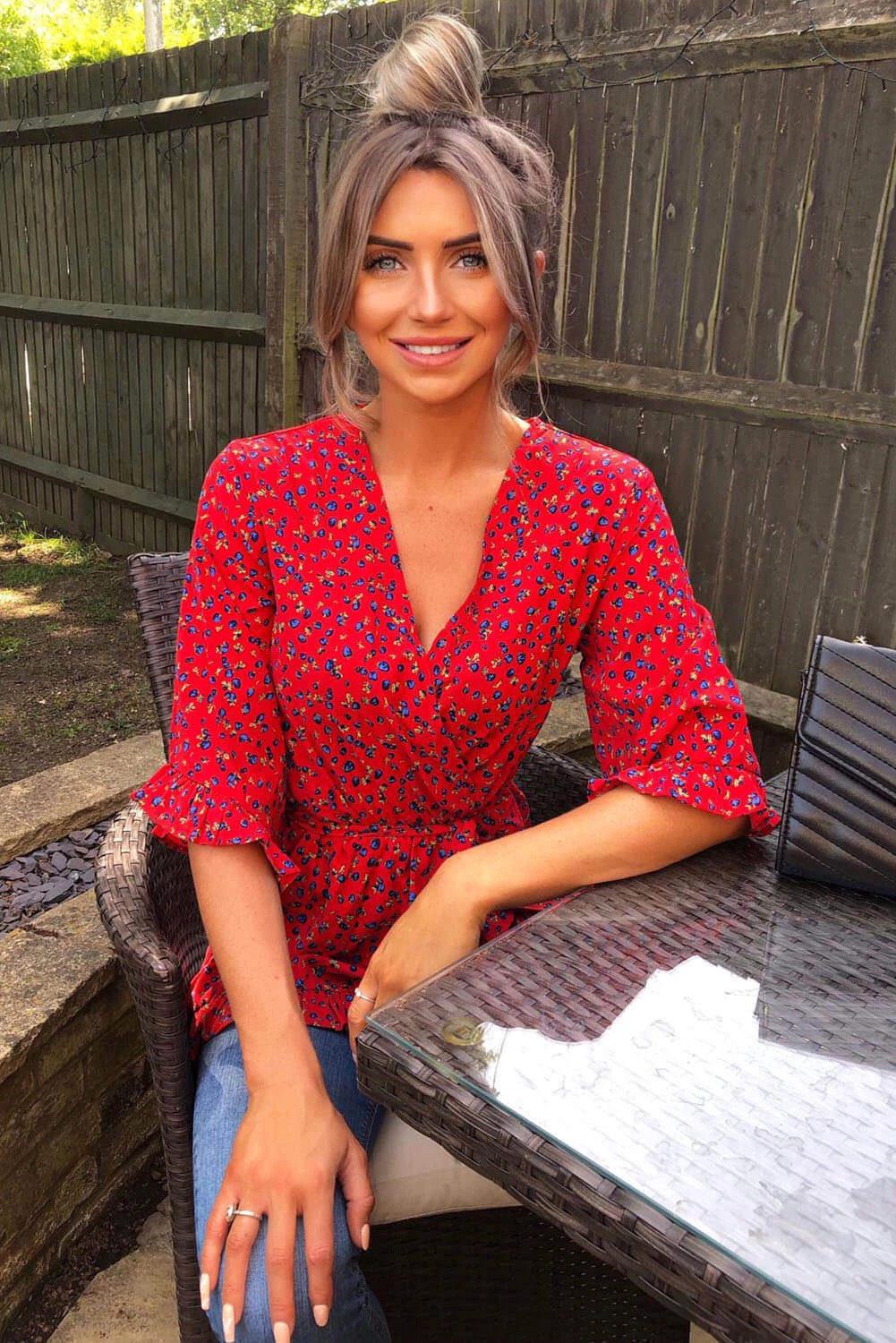 Look sophisticated with our Red Floral Wrap Top. Featuring ruffled