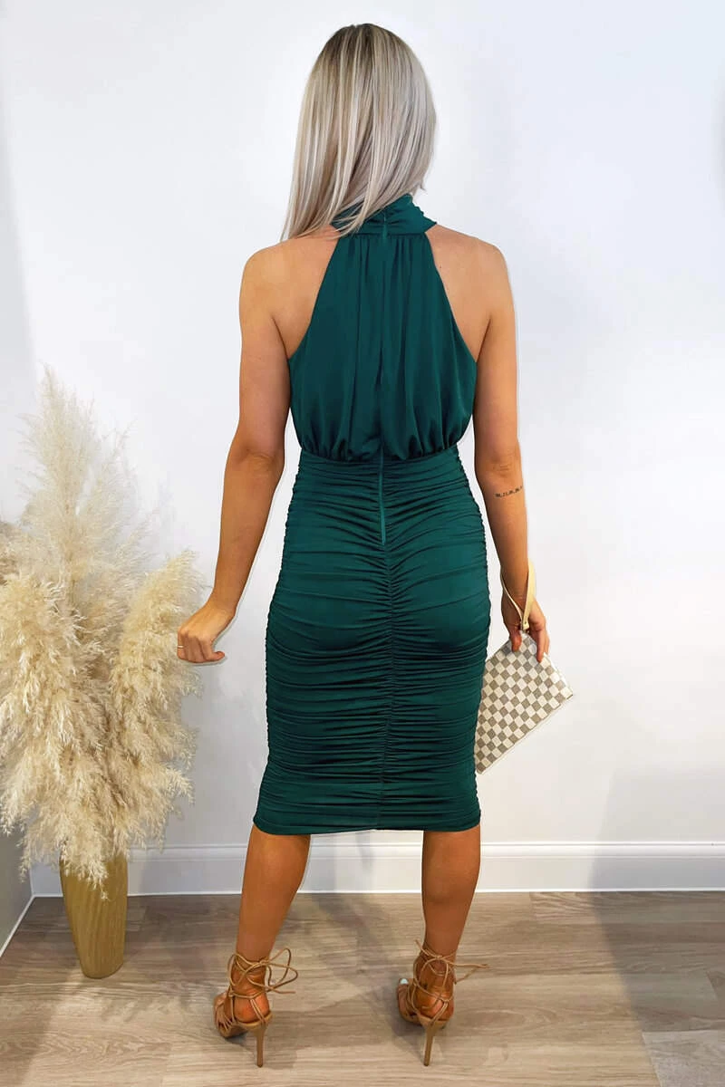 off those curves! A teal ruched bodycon dress with a high neck and a