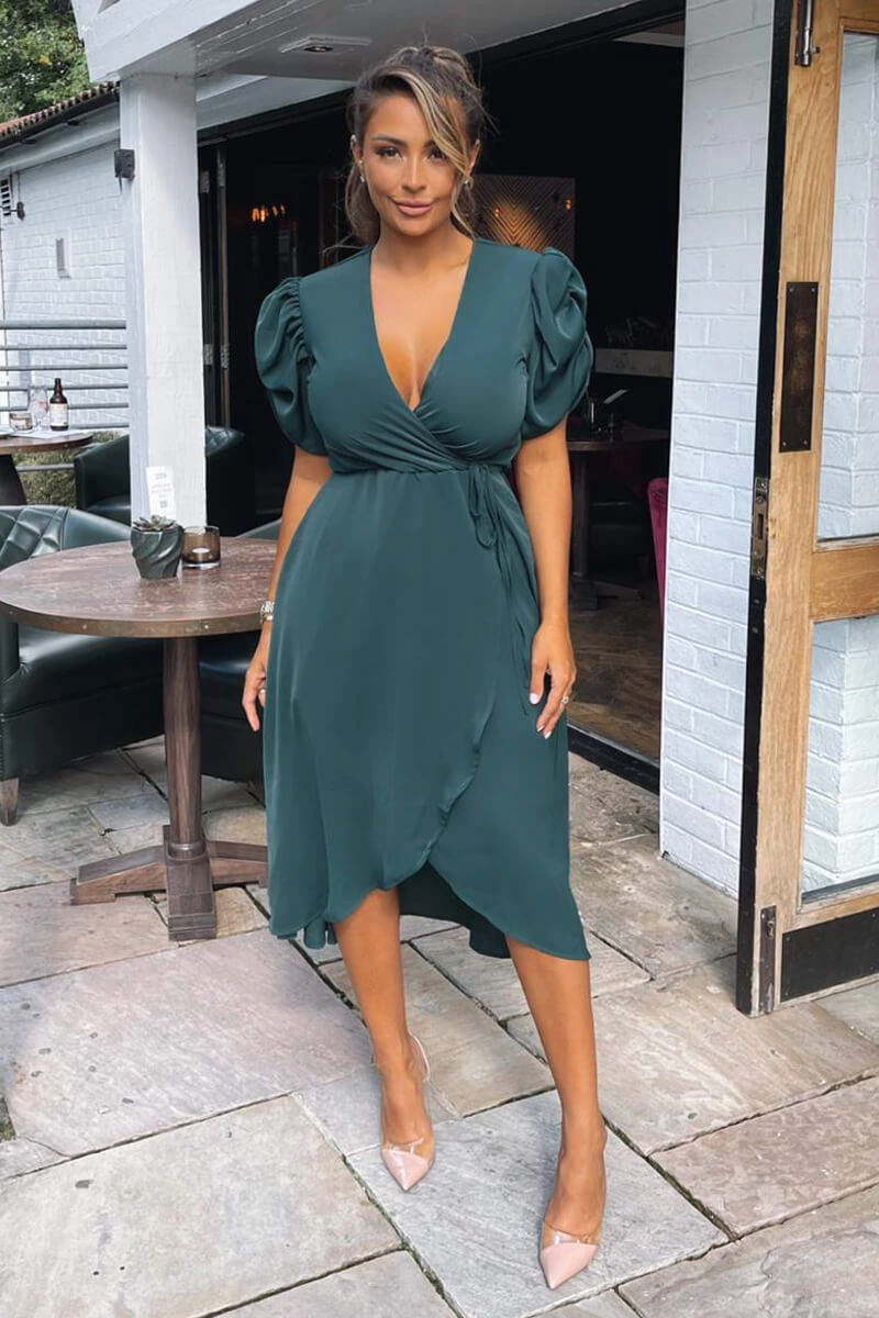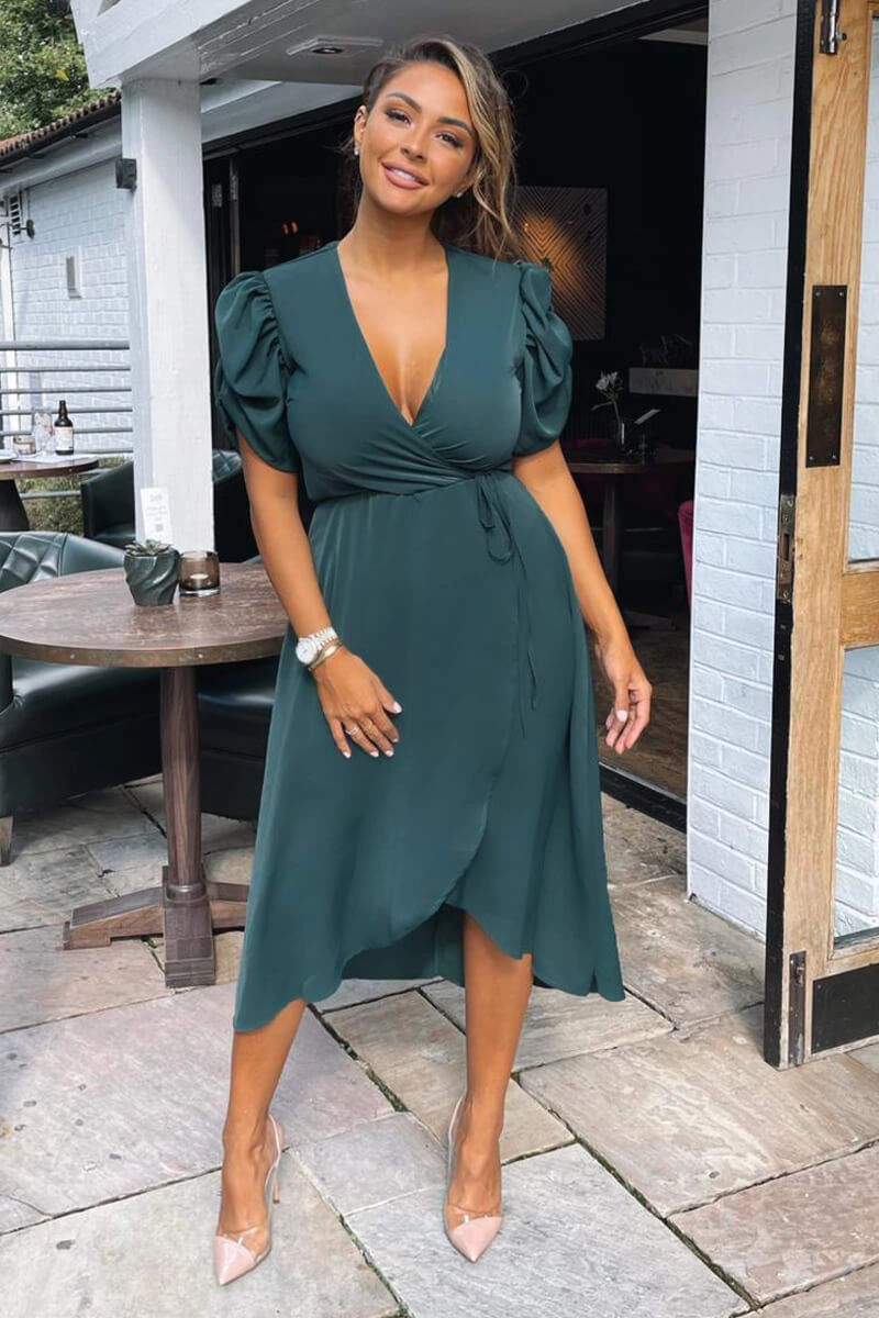 Stay on trend with this Teal Wrap over Tie Midi Dress! Featuring an a