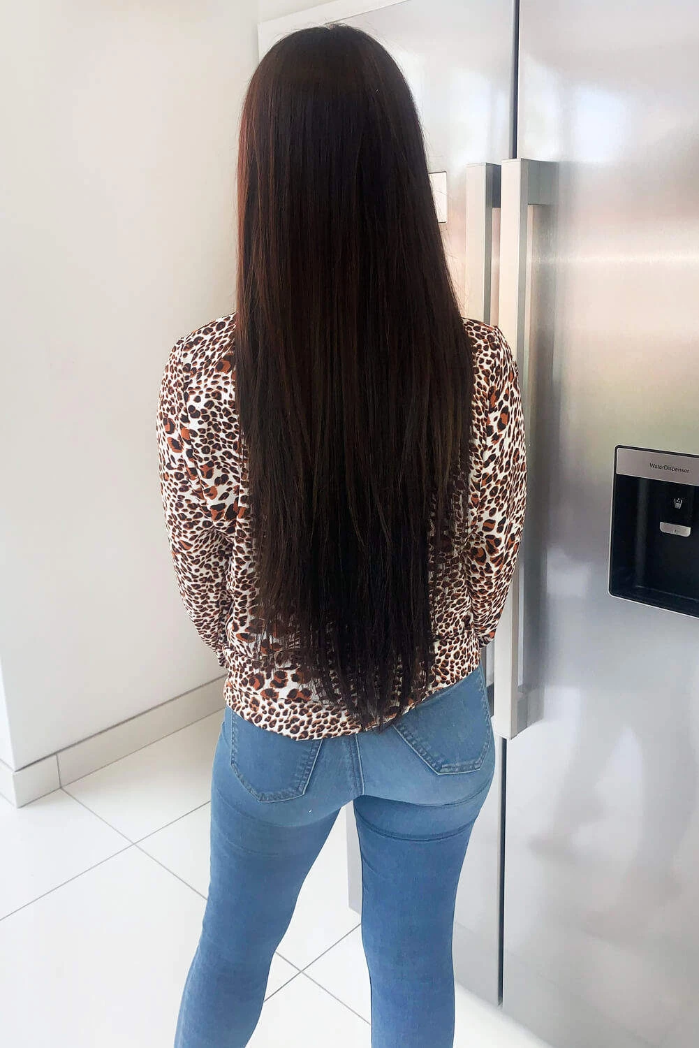 a leopard print pattern, long sleeves, a high ruffle neckline and a