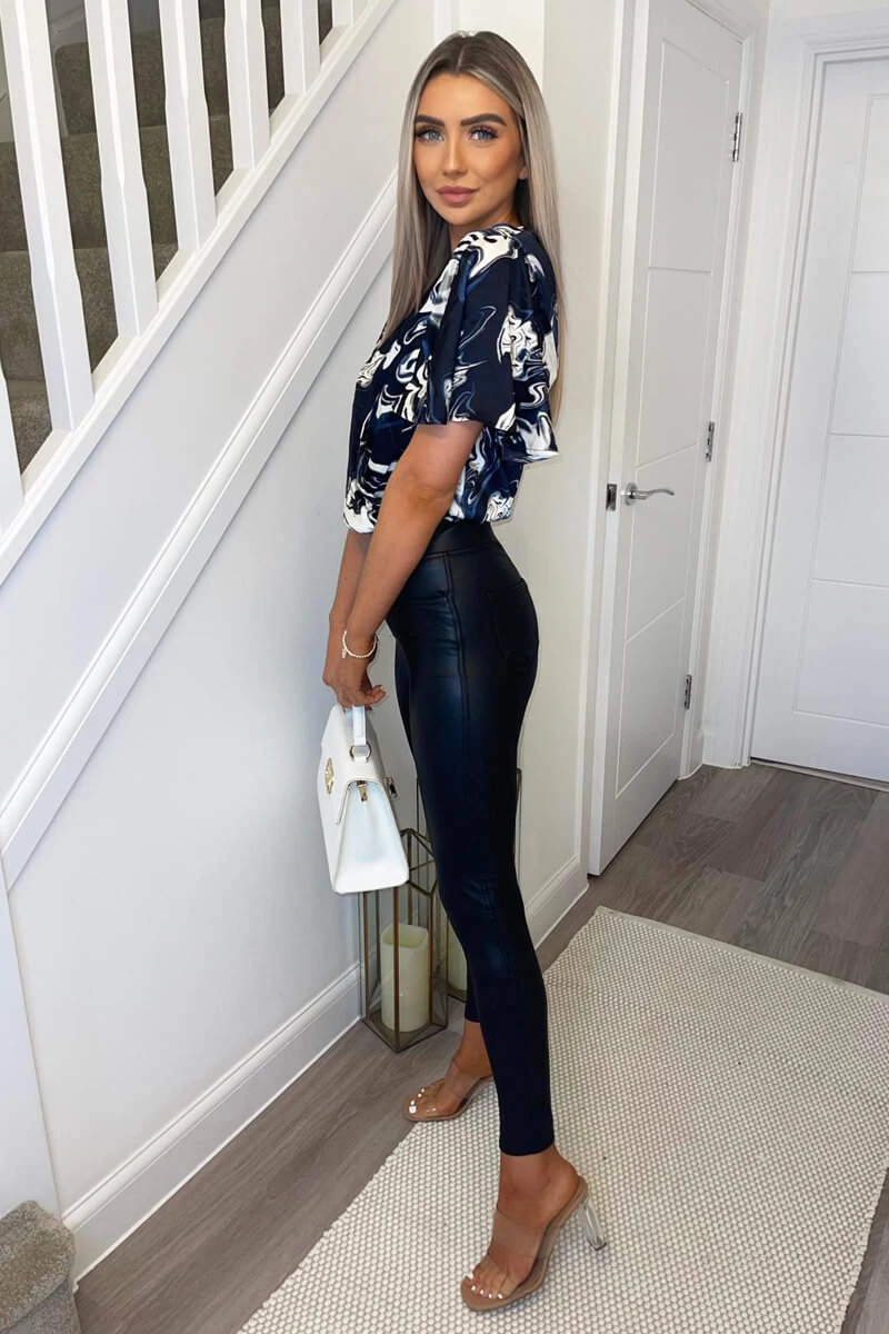 Stand out in this Navy Marble Print Wrap Over Bodysuit. A v-neckline